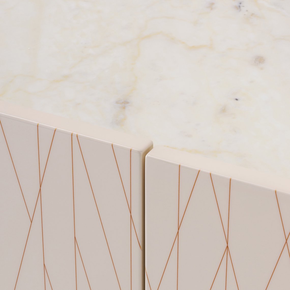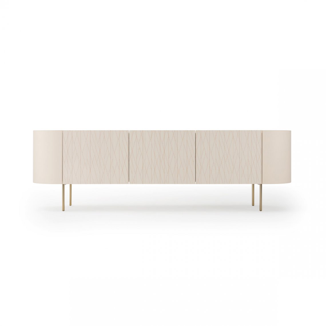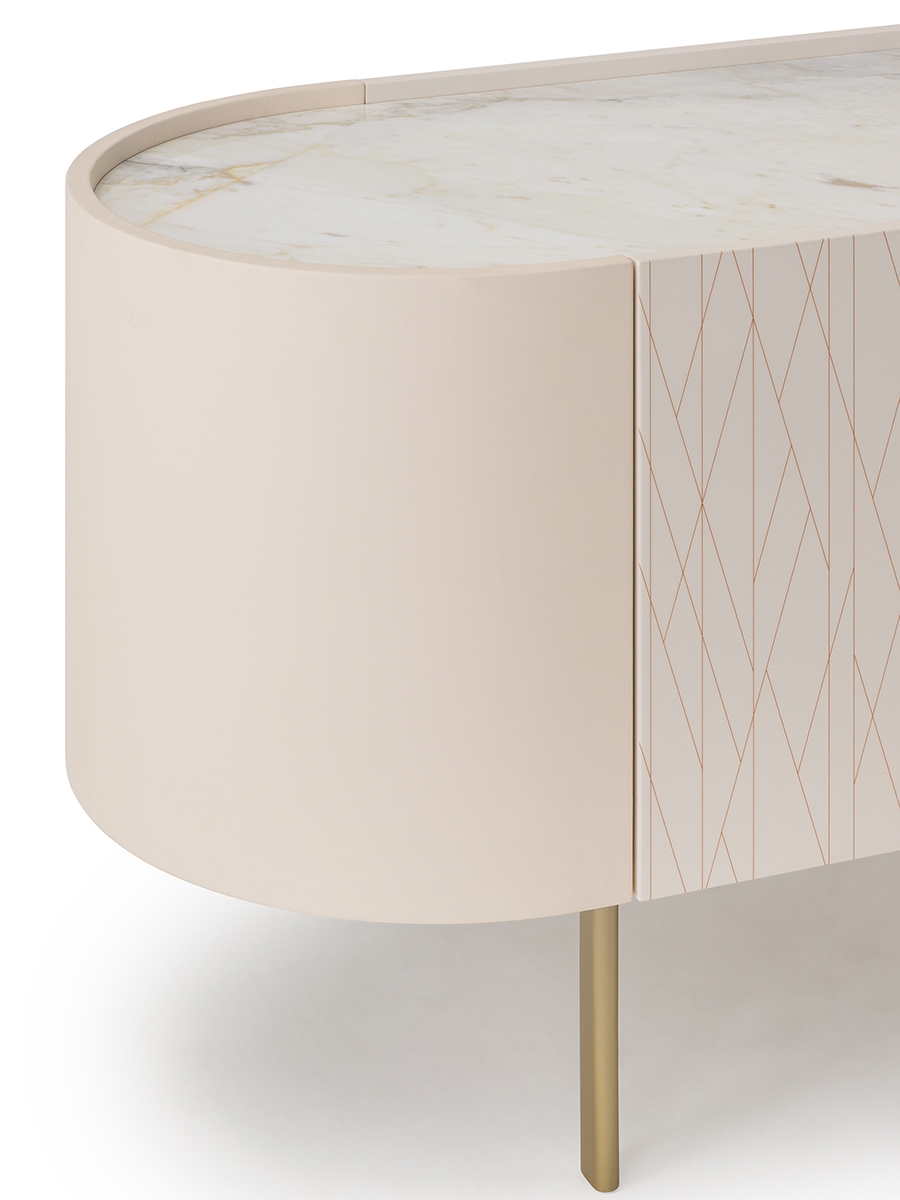 The design of the Roman sideboard features wooden or glass doors. The wooden version can be customized with geometric patterns for decoration. The Roman sideboard has different finishes as shown on the sample card.