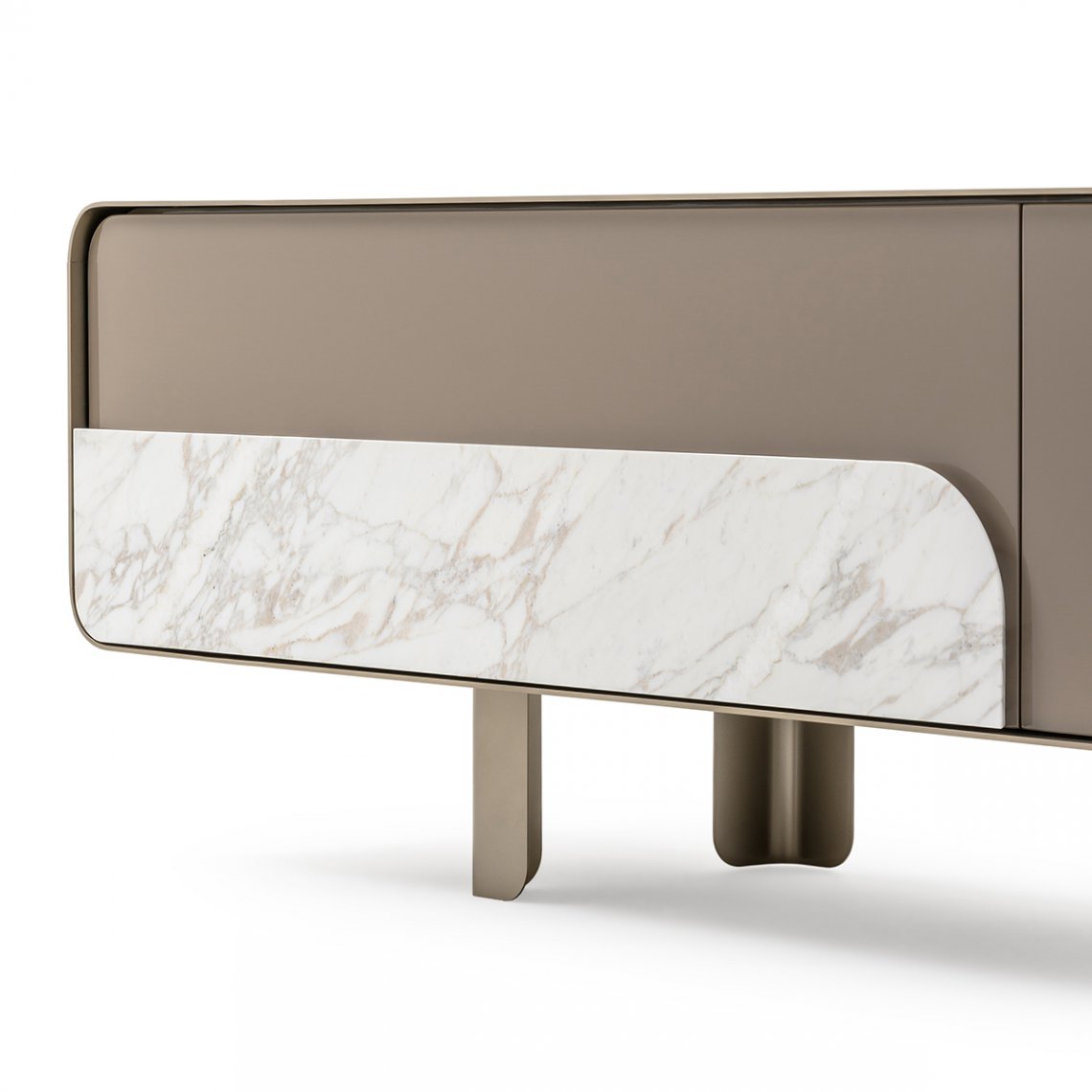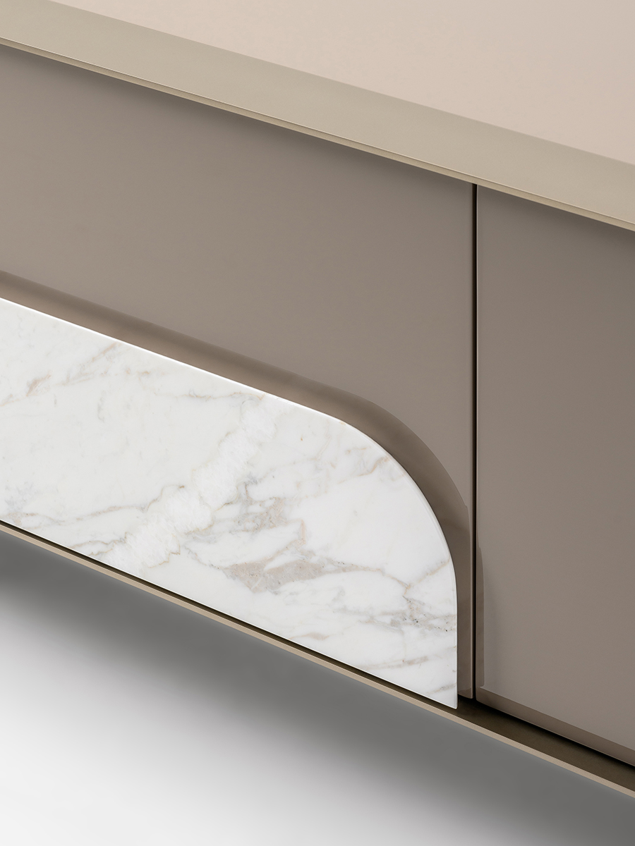 The Tv unit of the Soul collection has a metal edge that surrounds the entire front perimeter, emphasizing the sweetness of the shapes, while the absence of the handles finds an answer in the detail – in walnut or marble – applied to the lacquered structure, essential for the opening of the doors and drawers. The Soul Tv unit is available in different finishes as per sample.