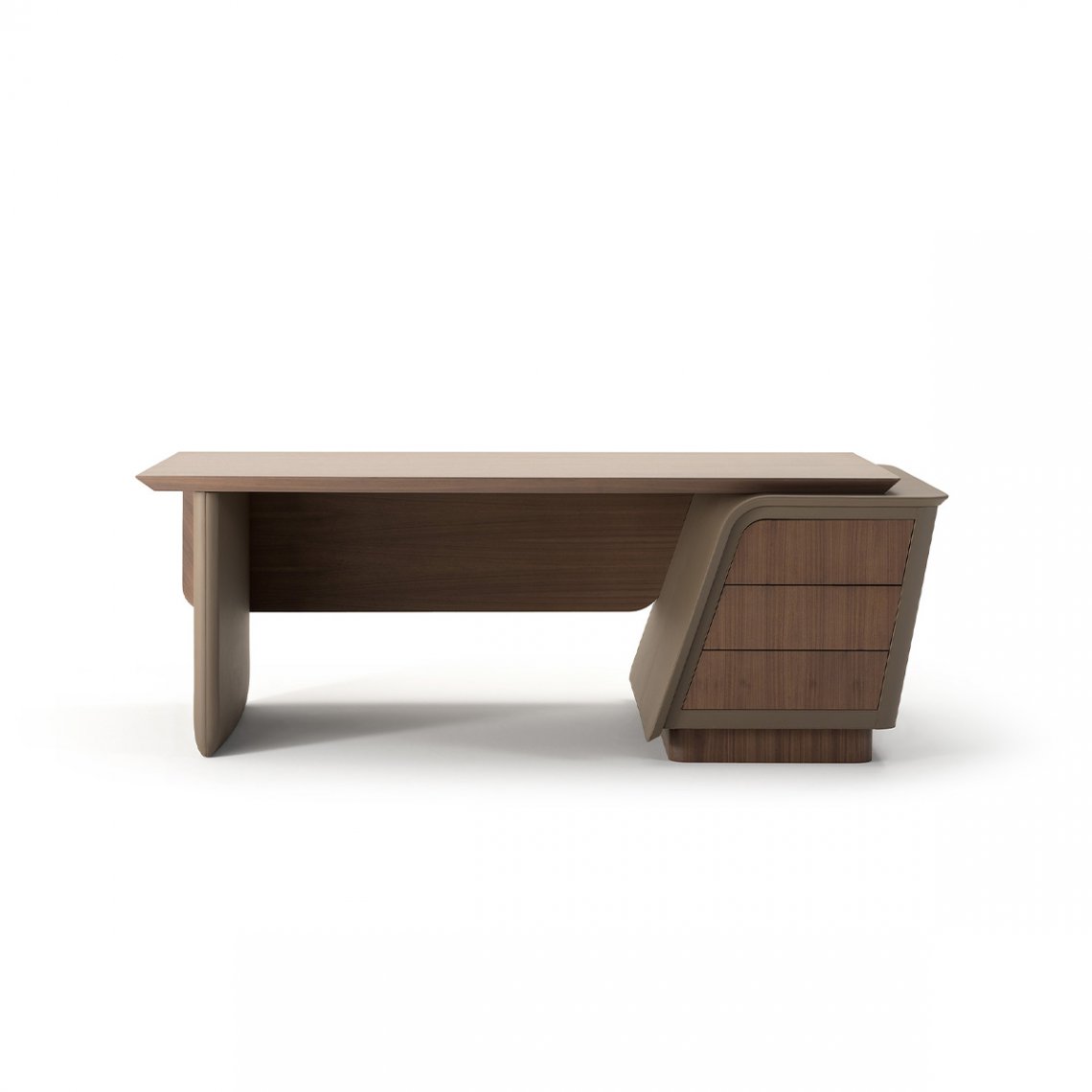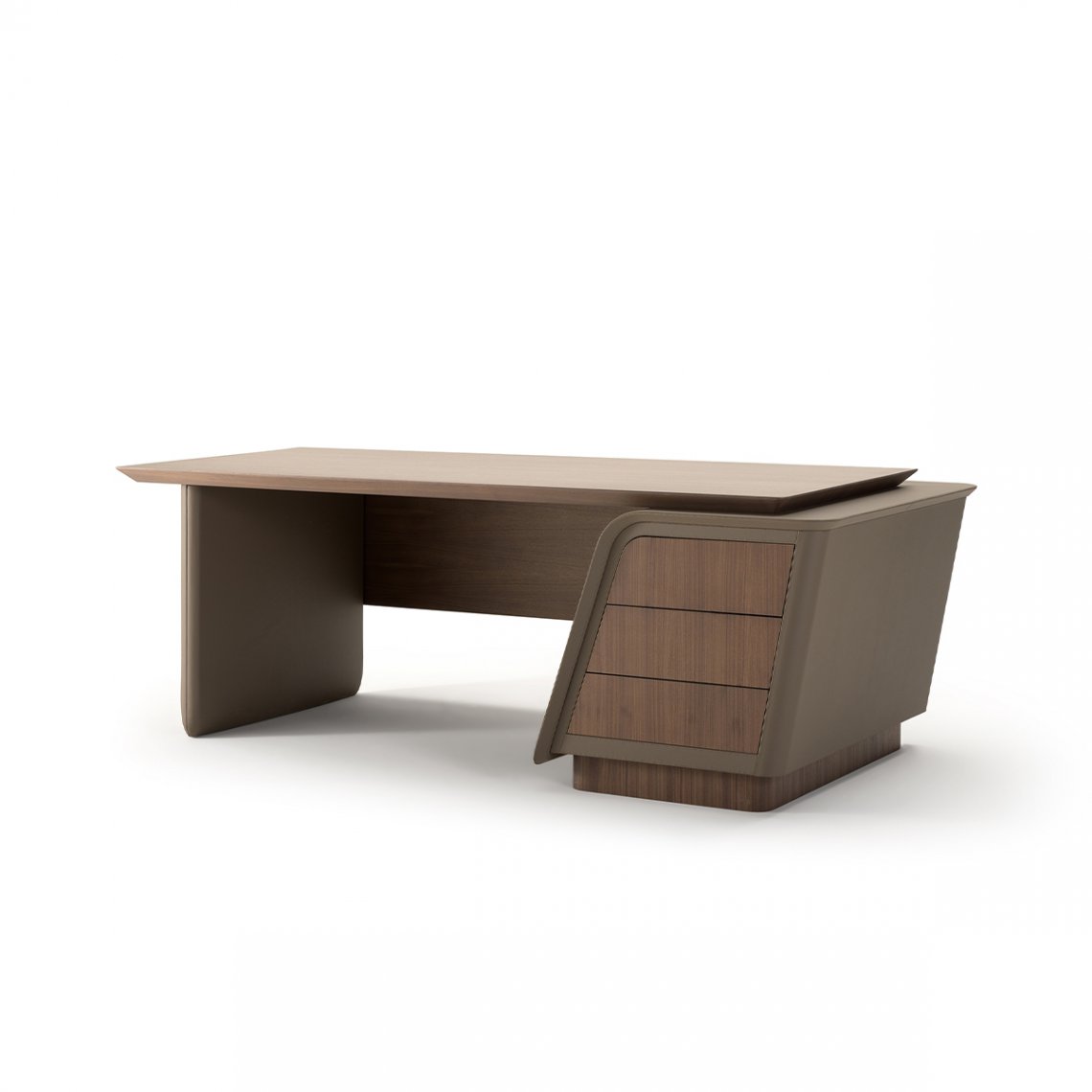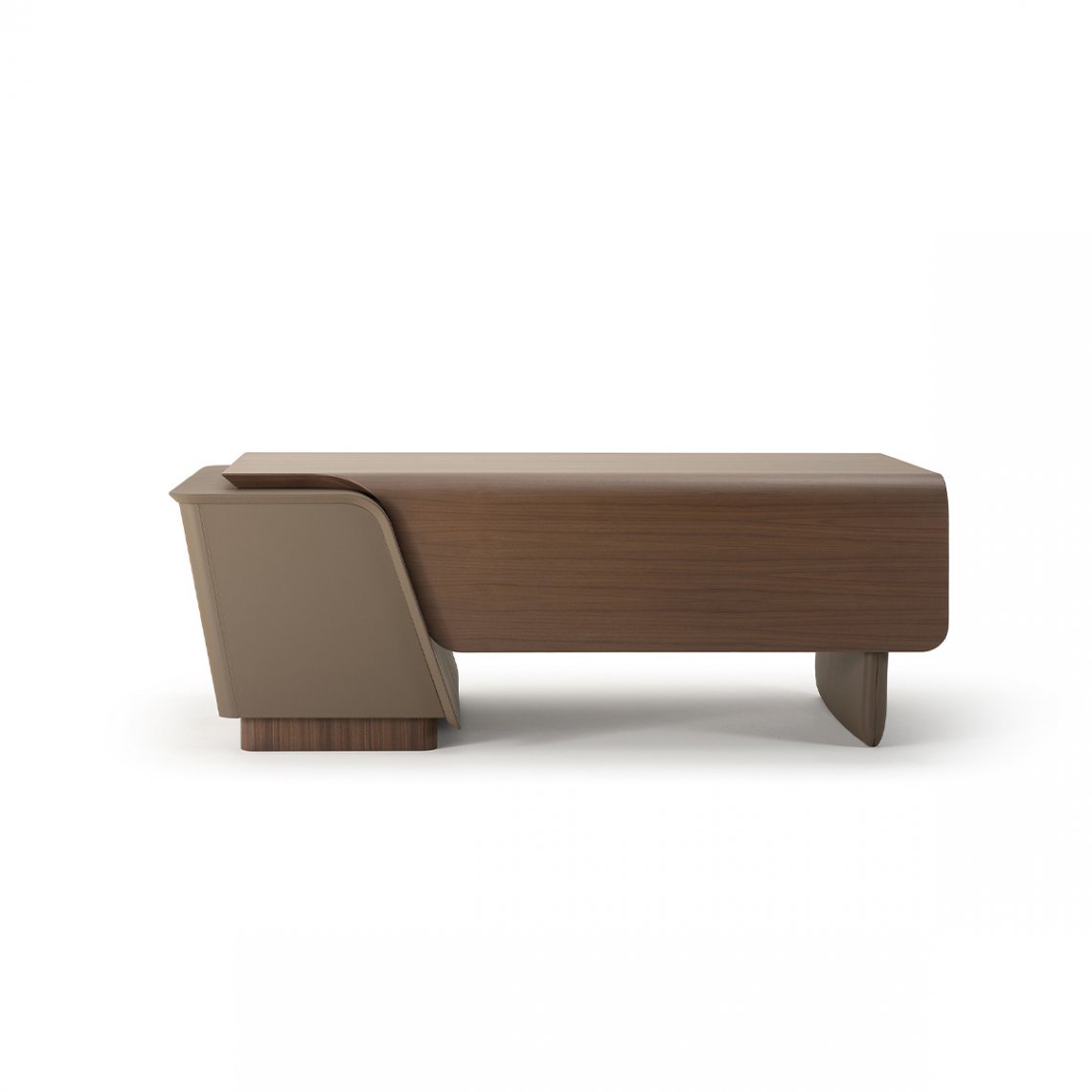 The Blues desk has an important structure and an original formal aspect. The processing of leather and walnut wood is the real protagonist. The legs of the desk are equipped with drawers covered in leather. The Blues presidential desk is available in different finishes as per sample card.