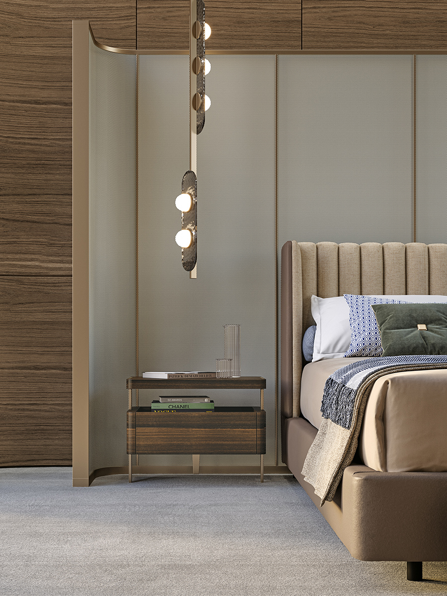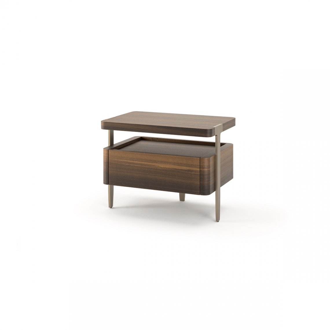 The Domus bedside table is in perfect balance between contemporaneity, the search for uniqueness and functionality. The Eucalyptus wood structure is supported by Matt Light Platinum metal legs. The Domus bedside table is available in different finishes as per sample card.