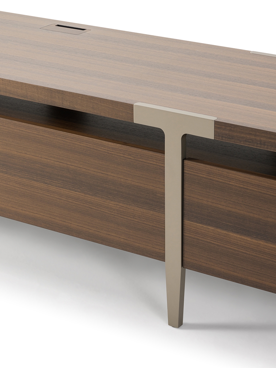 The slim and thin Tv unit of the Domus collection, in Eucalyptus wood with metal legs, is characterized by a raised top, two doors on the sides and a flap door in the center. The Domus Tv unit is available in different finishes as per sample card.