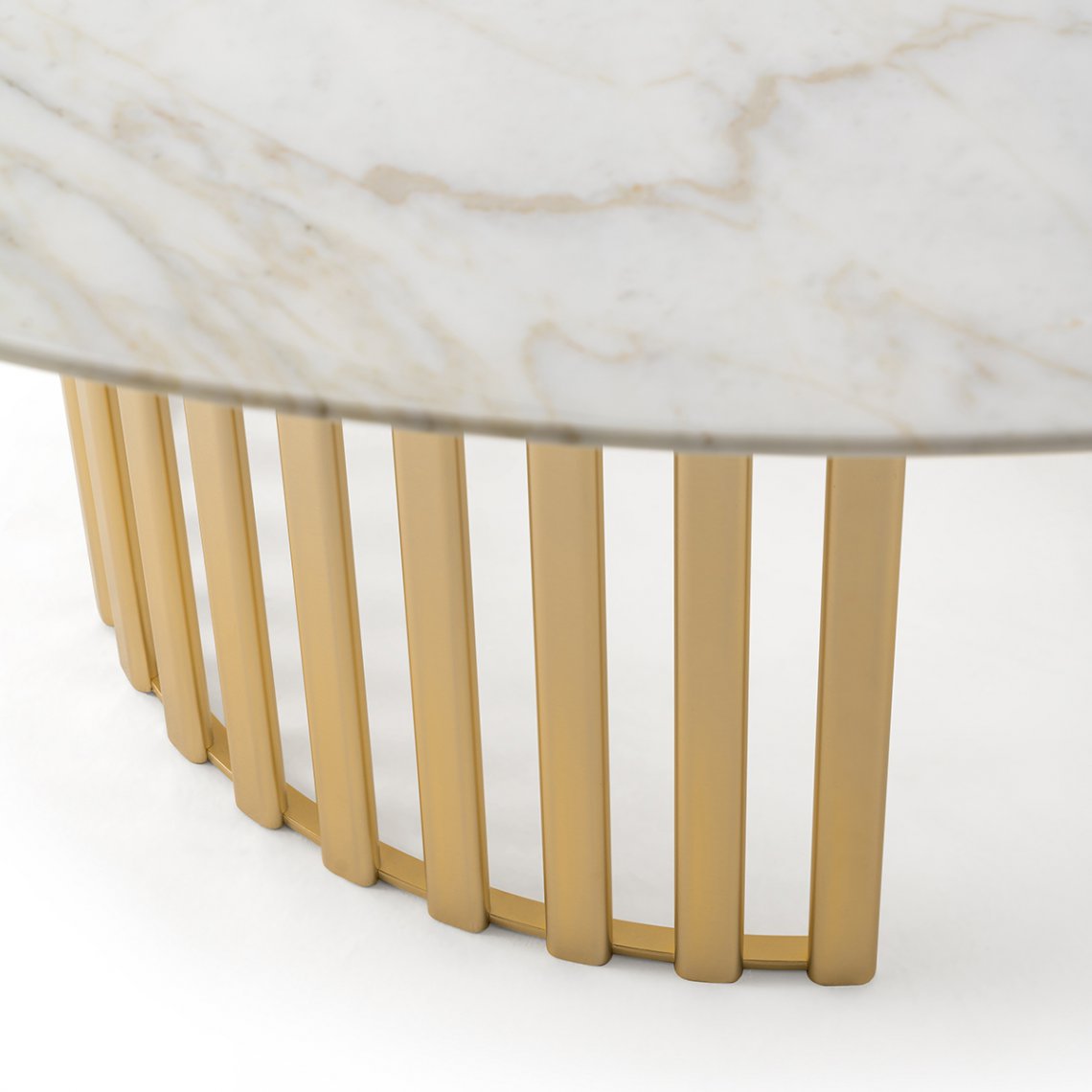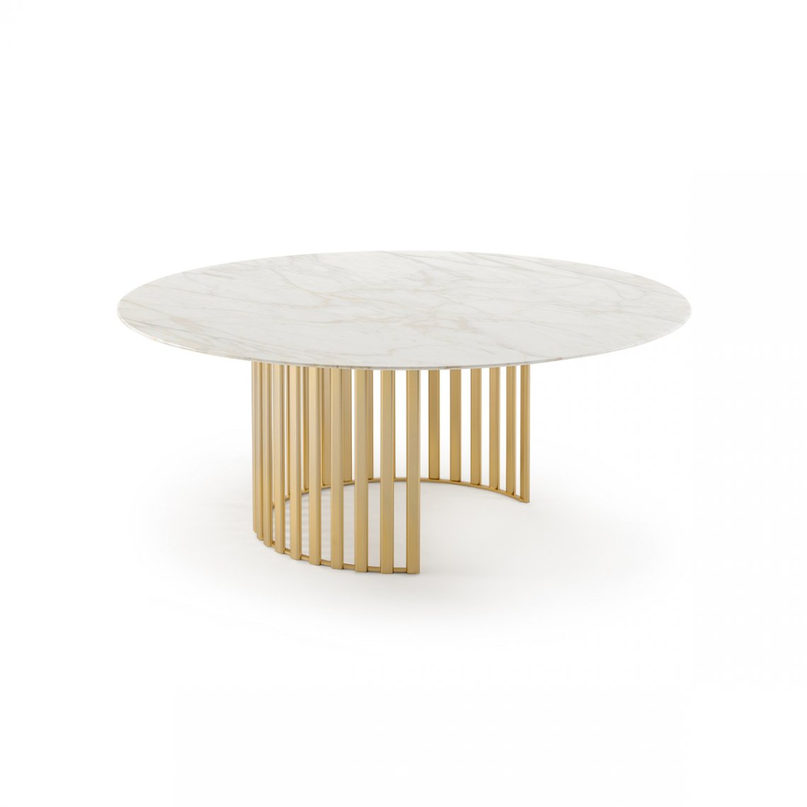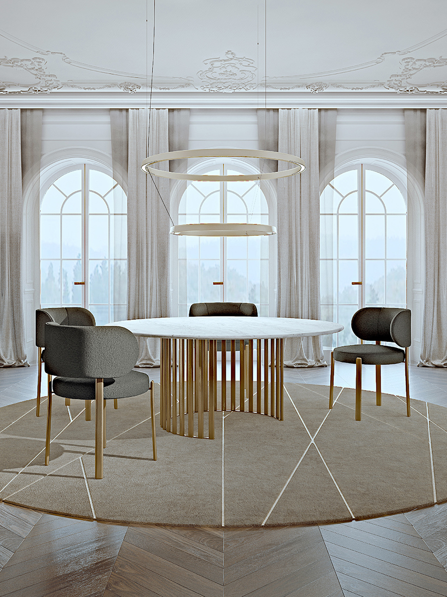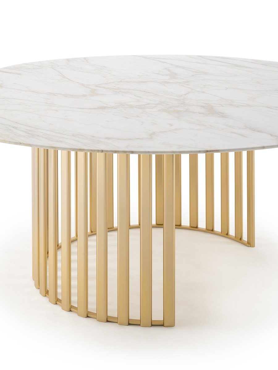 The Roma round table confirms the circular thinking of the entire collection in the presence of the legs and the top and is characterized by a singular metal base composed of vertical tubulars (available in the Champagne Gold and Graphite Gray finishes), with a round top in single-color lacquered marble or wood. The Roma table is available in different finishes as per sample card.