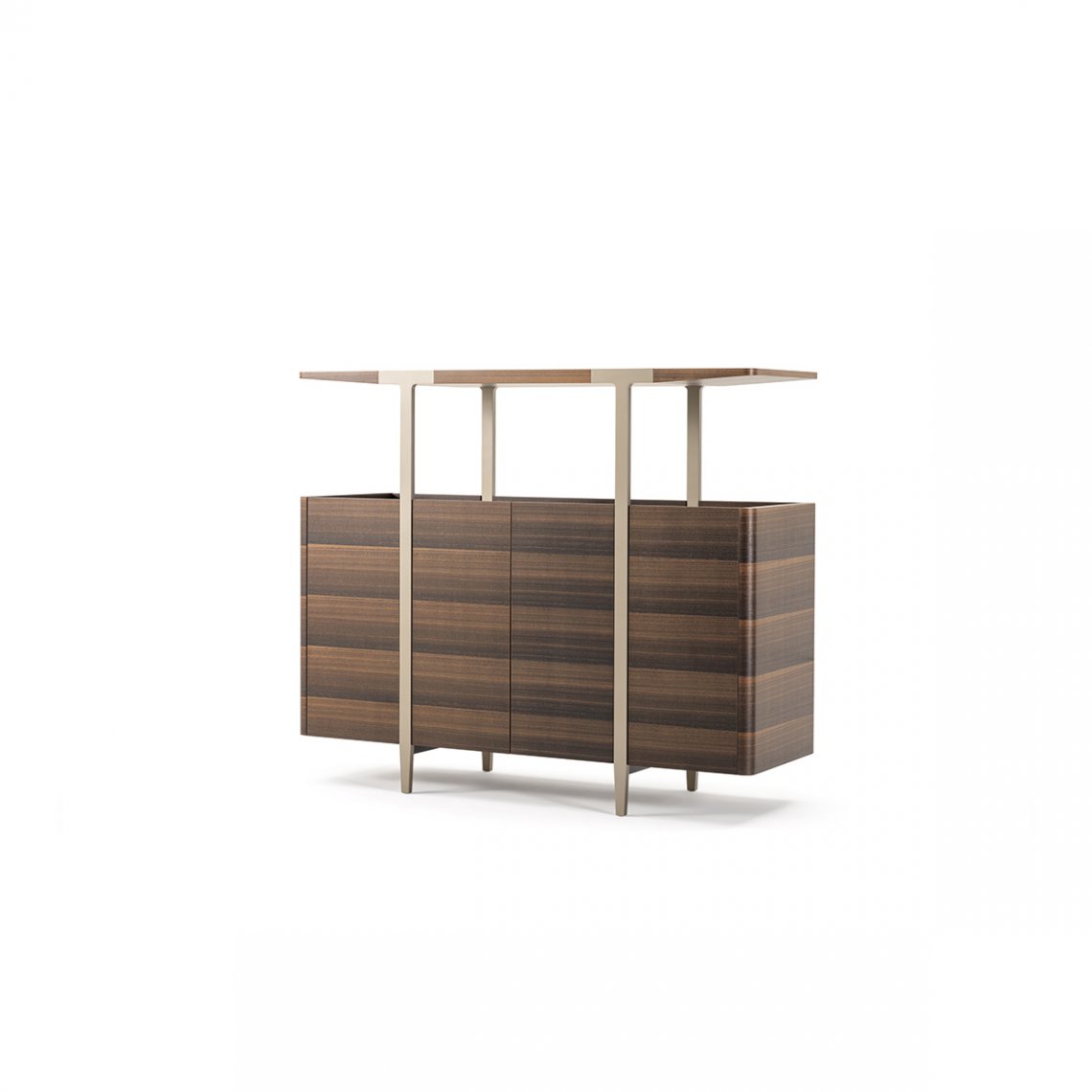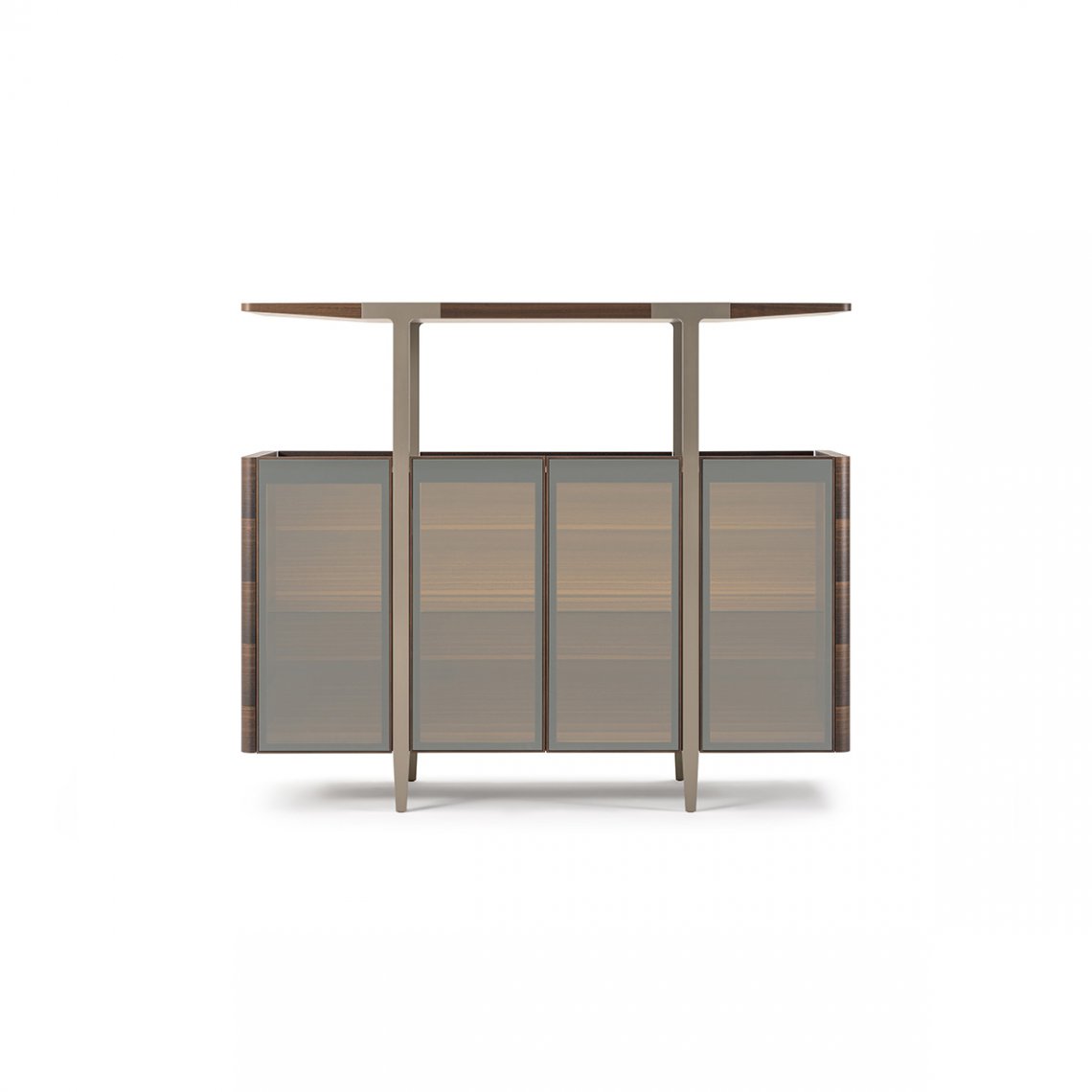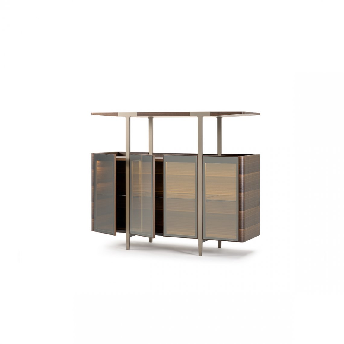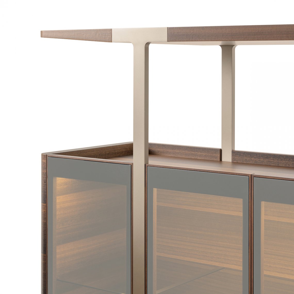 The vitrine from the Domus collection, stands out for the refined balance between shapes and spacious volumes contrasted with a slender and minimal line, where full and empty are the characteristic feature of its character. Available with a structure with four customizable doors in mirrored glass or wood. The Domus vitrine is available in different finishes as per sample card.