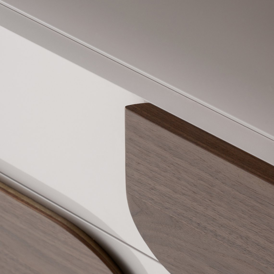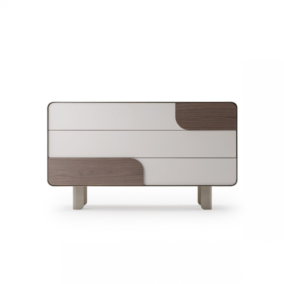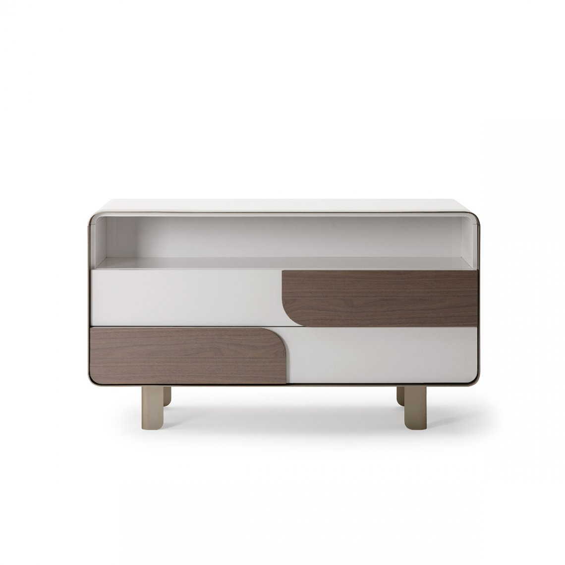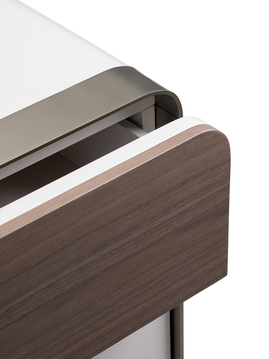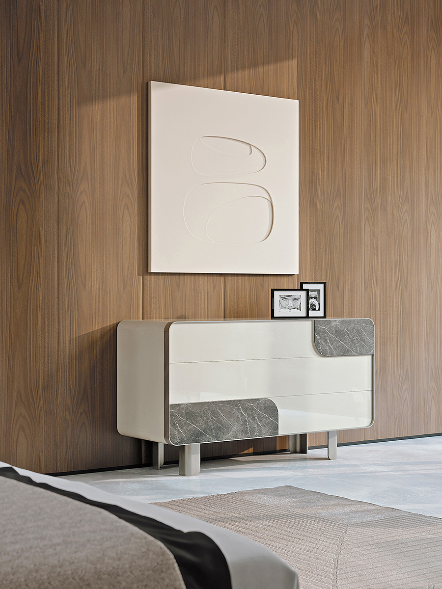 The chest of drawers of the Soul collection in glossy lacquer and wood, simple and always with a rounded line, is suspended on four sculptural feet in bent sheet metal. As for the TV cabinet, the function of the handles is resolved in the presence of inserts in walnut or marble. The Soul chest of drawers is available in different finishes as per sample card.