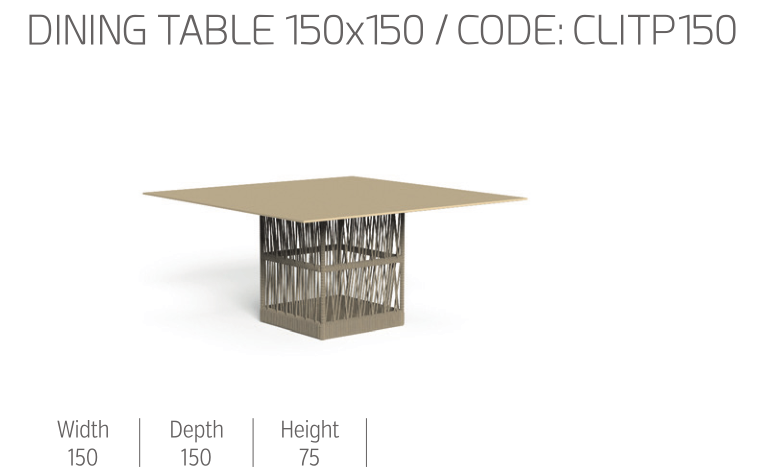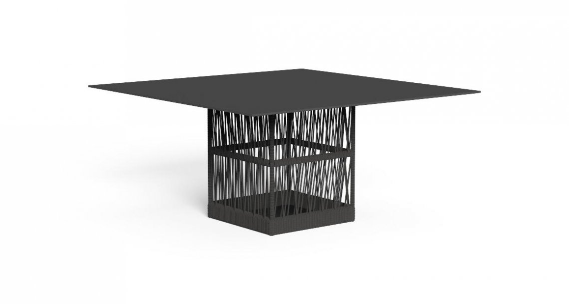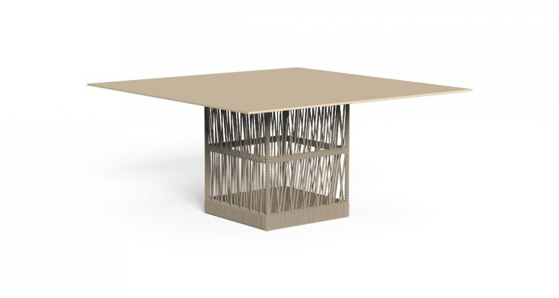 L’intreccio di corde della collezione Cliff sostiene il piano in alluminio di forma quadrata. La struttura in tubolari metallici è nascosta dalla corda che sembra sorreggere il piano richiamando il gioco di chiaroscuri che si ritrova anche negli altri elementi della collezione Cliff.