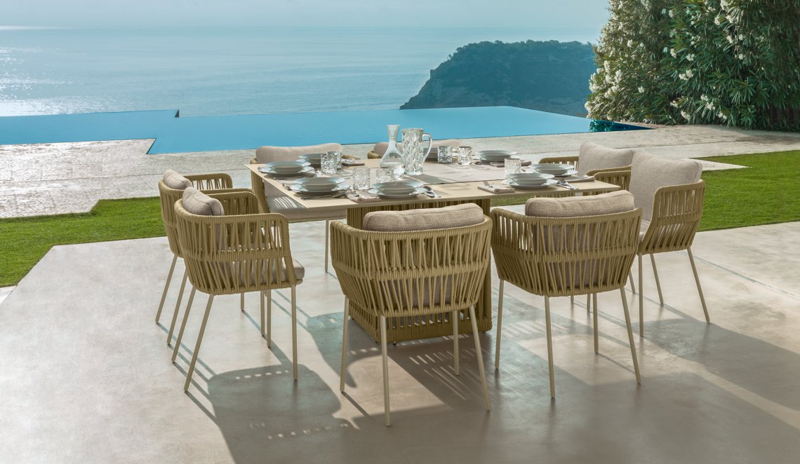 La struttura è in alluminio verniciato a polvere nei colori Beige e Grafite, le basi dei tavoli prevedono un intreccio di corde in tessuto sintetico in tinta al colore del piano.