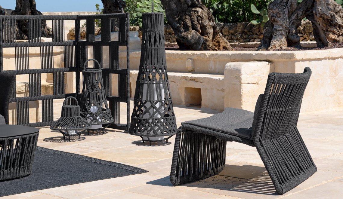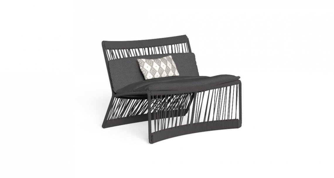 La particolare poltrona è sostenuta da una struttura metallica con corde intrecciate tipica degli altri elementi della collezione. Il cuscino fino è l’elemento di rottura rispetto alle altre sedute della collezione a cuscini spessi che ben si sposa con l’idea di varietà e giocosità che i designer hanno voluto suggerire in Cliff.