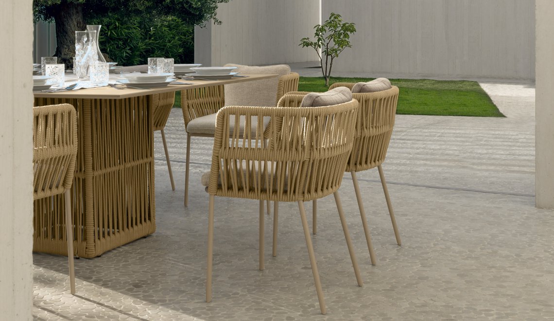 L’intreccio di corde tipico della collezione avvolge la seduta creando una seggiola che ben completa la collezione Cliff. L’intreccio colpisce per la sua elegante complessità che sottolinea la preziosità di qualunque outdoor nel quale la seggiola venga collocata.
