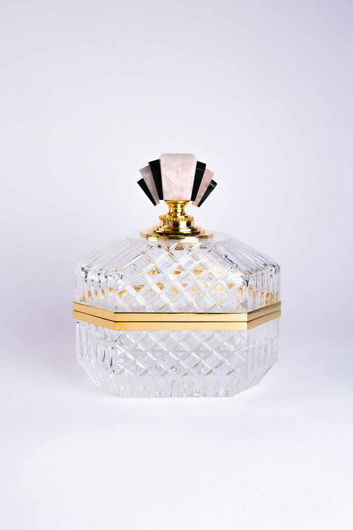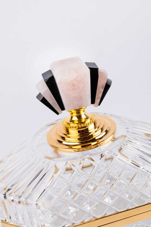 The diamond’s brightness of the french cut crystal exalts the deep color and grain of the stone. A jewel detail that embellishes this casket box in a perfectly Art Decò style and yet with a contemporary design. Each crystal is hand-cut and therefore unique.