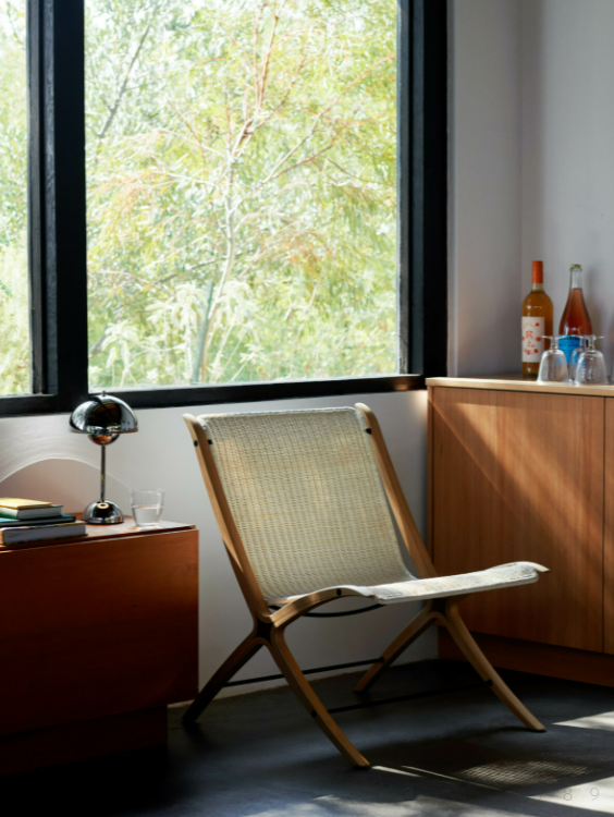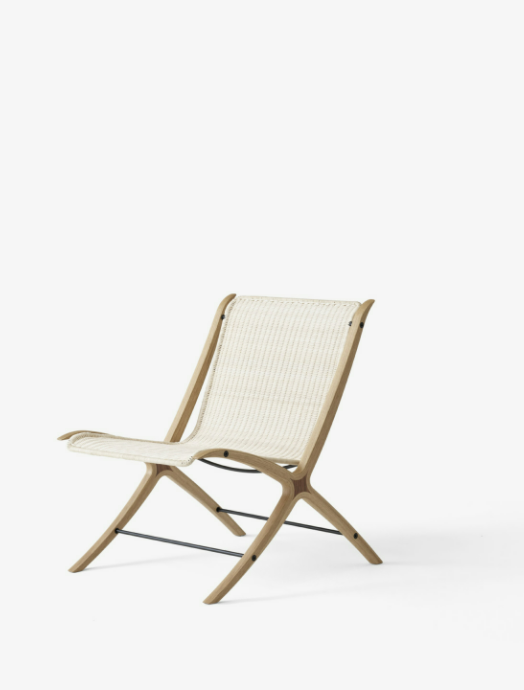 Veneer sheets formpressed together towards a solid wood insert. Milled into shape and lacquered. Natural Rattan weaved around a powder coated stainless steel frame.