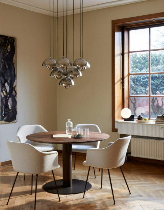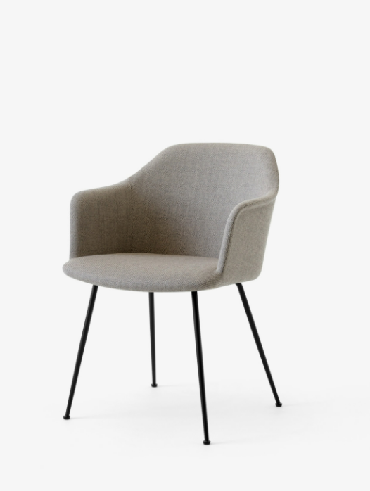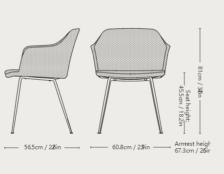 Veneer sheets formpressed together towards a solid wood insert. Milled into shape and lacquered. Natural Rattan weaved around a powder coated stainless steel frame.