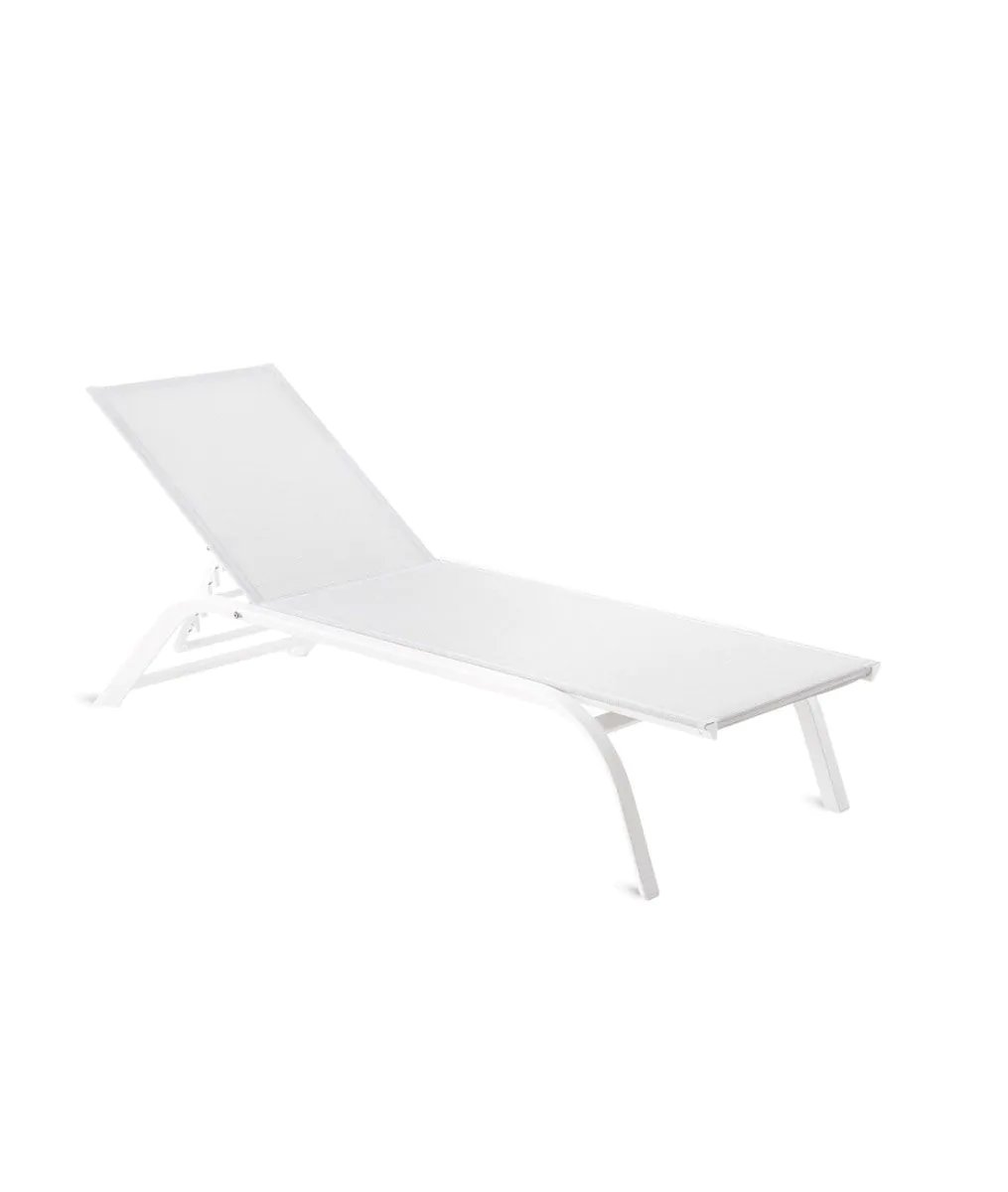 ll lettino è realizzato in alluminio con un tessuto tecnico che unisce la resistenza del PVC alla morbidezza della trama composta da ciniglia di poliestere. Disponibile nei colori grafite e bianco.