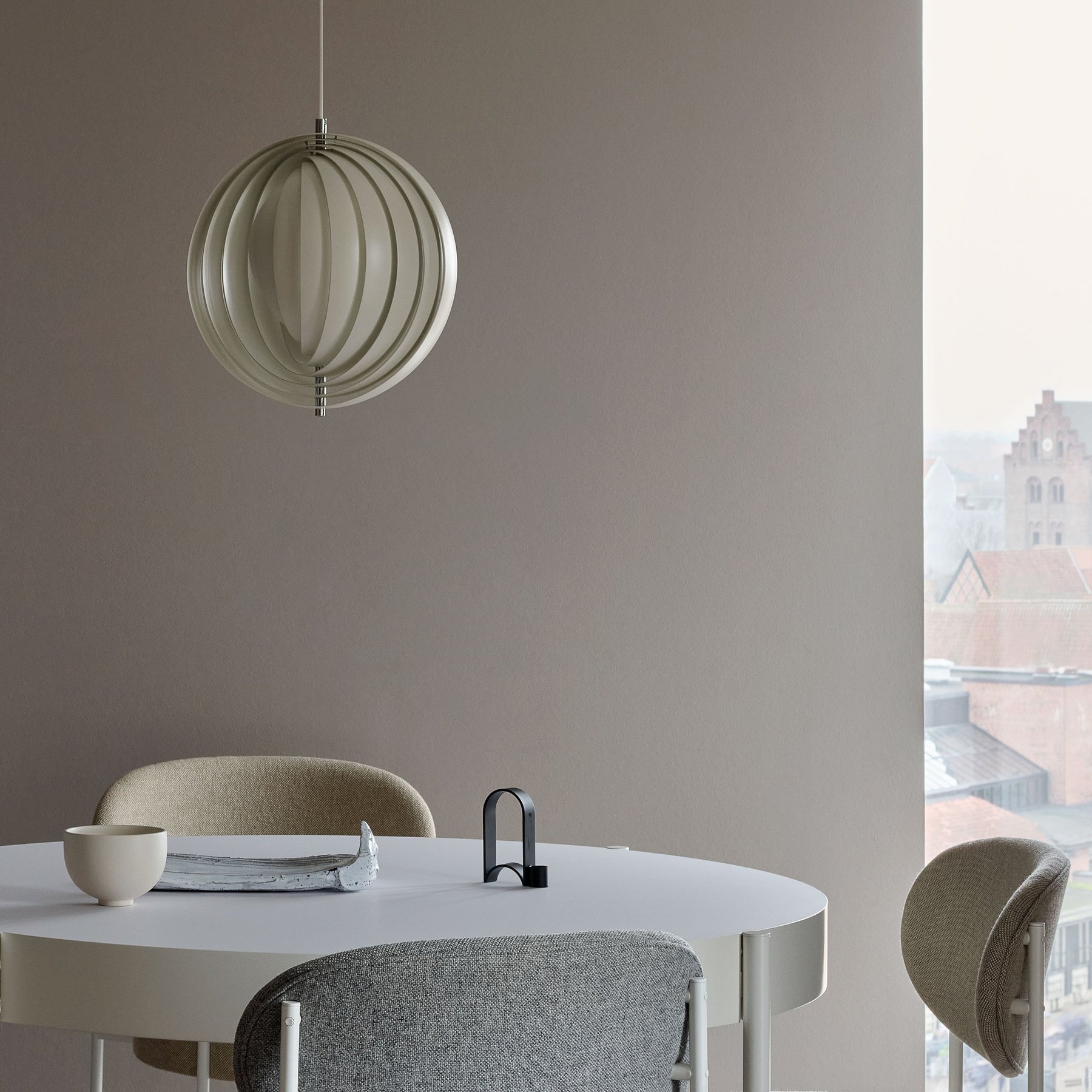 Designed in 1960, the Moon represents one of Verner Panton’s earliest designs in lighting. The iconic pendant is characterized by its fan-like design with ten ring-shaped aluminum lamellae perfectly positioned to provide a soft, ambient and glare-free light. The blades reflect and filters the light and the pendant changes its appearance depending on the angle at which you view it.
