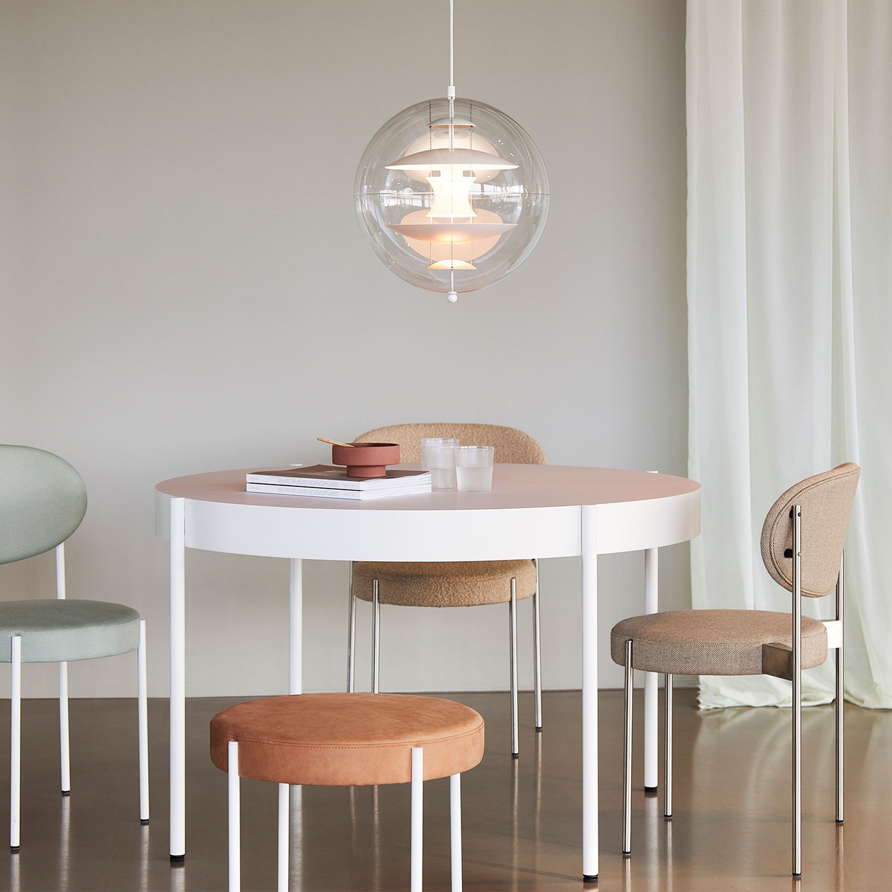 This decorative VP Globe - Warm Peach pendant features a crystal clear transparent acrylic outer sphere with five internal reflectors suspended by three steel chains. Splashes of warm peach add the finishing touches to the iconic design and highlights the unmistakable Panton design DNA. With the VP Globe, Panton’s ambition was to design a lamp that could catch the eye and unite a room, regardless of whether it hung alone or in clusters. This makes the pendant an ideal choice above a dining room table, in a hallway or long corridor, or as a sculptural element in a corner.