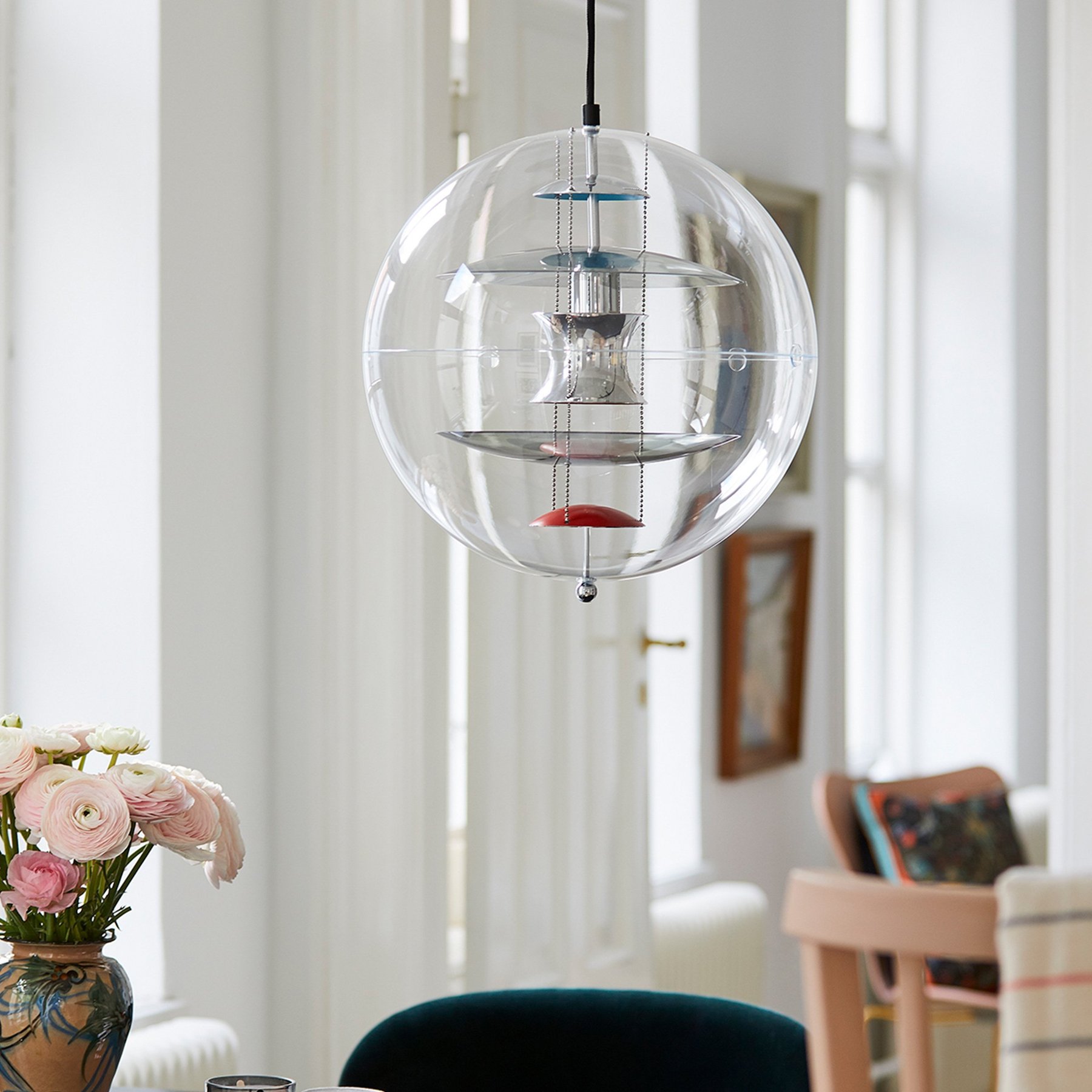 This decorative VP Globe Coloured Glass pendant features a crystal clear transparent acrylic outer sphere with five internal reflectors suspended by three steel chains. Splashes of red and blue add the finishing touches to the futuristic sculptural design and highlights the unmistakable Panton design DNA. With the VP Globe, Panton’s ambition was to design a lamp that could catch the eye and unite a room, regardless of whether it hung alone or in clusters. This makes the pendant an ideal choice above a dining room table, in a hallway or long corridor, or as a sculptural element in a corner.