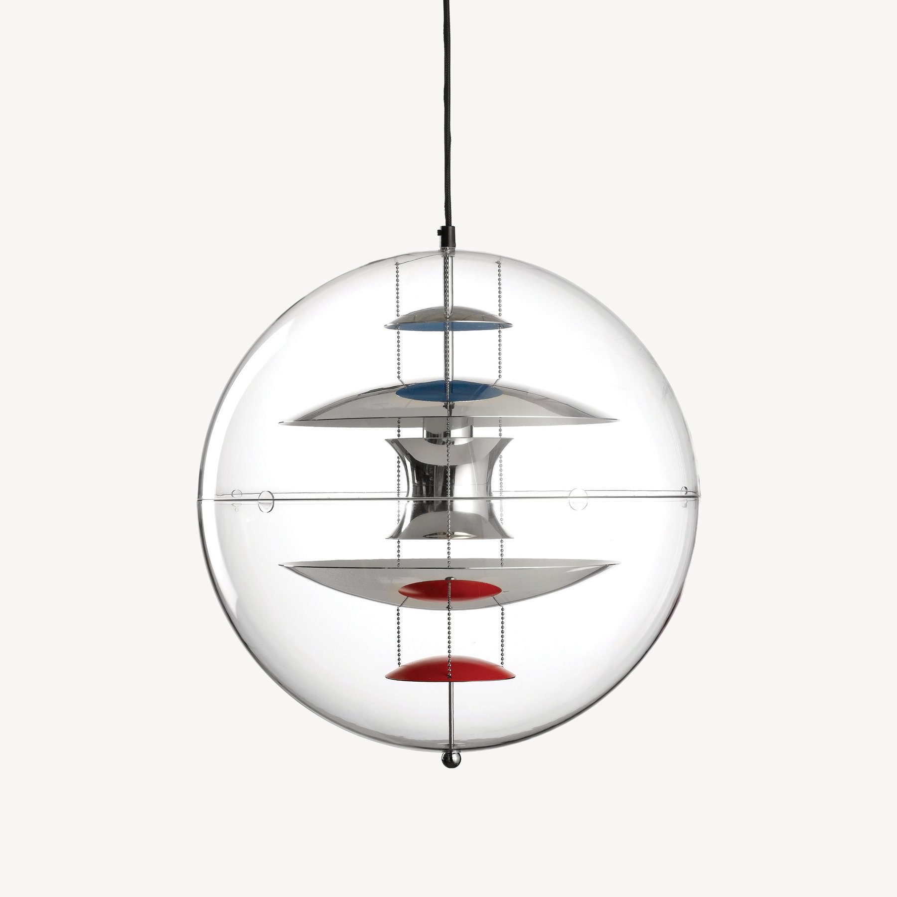 The decorative VP Globe pendant features a crystal clear transparent acrylic outer sphere with five internal reflectors suspended by three steel chains. Splashes of red and blue add the finishing touches to the futuristic sculptural design and highlights the unmistakable Panton design DNA. With the VP Globe, Panton’s ambition was to design a lamp that could catch the eye and unite a room, regardless of whether it hung alone or in clusters. This makes the pendant an ideal choice above a dining room table, in a hallway or long corridor, or as a sculptural element in a corner.