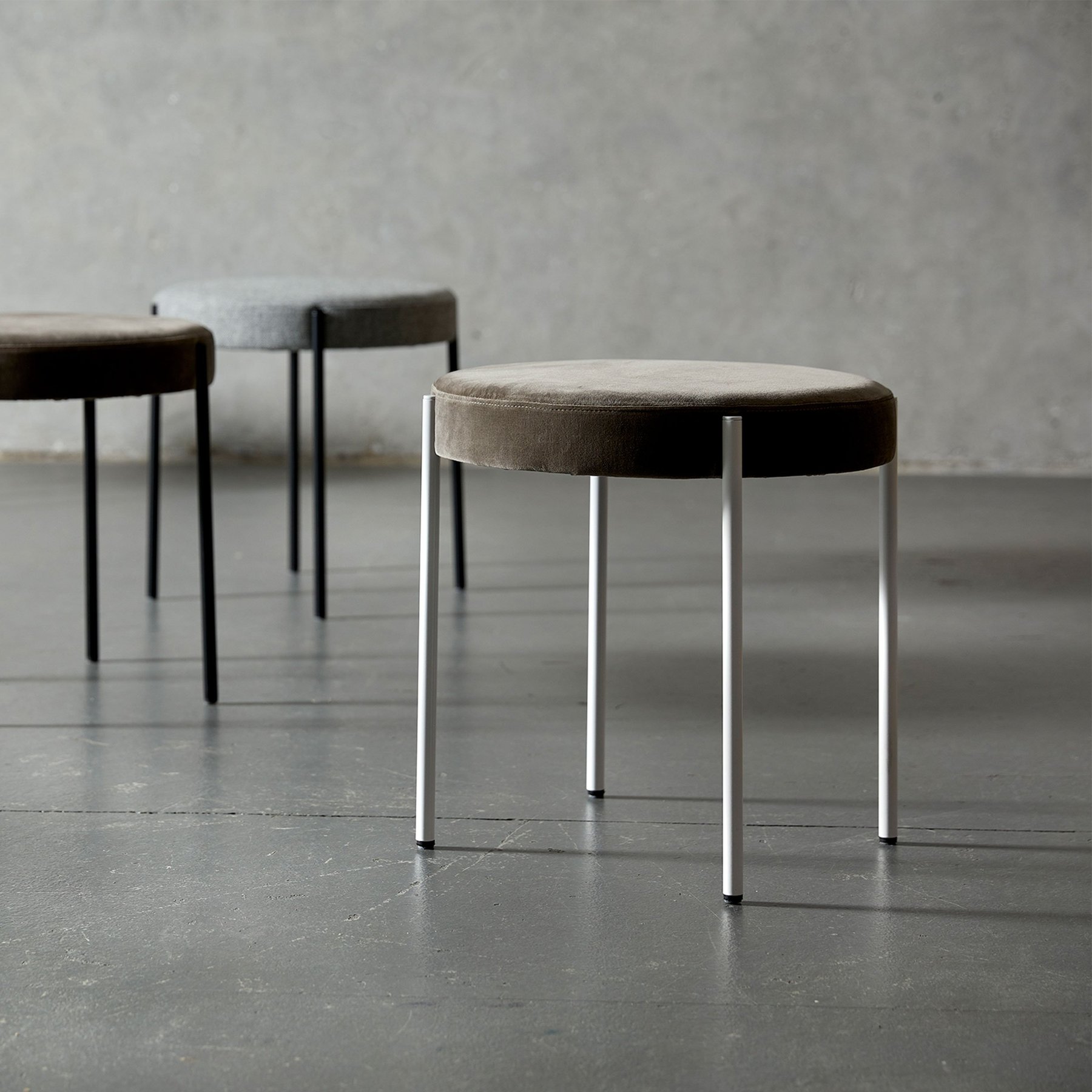 Verner Panton designed the Series 430 Stool as part of the Series 430 family. A study in simplicity, with a high level of comfort. He applied traditional webbing to the fully upholstered seat to adjust for body weight and placed it on a slender elegant frame that mounts on the outside of the seat. Use as a great extra seat for the dining table or as a stand alone piece.