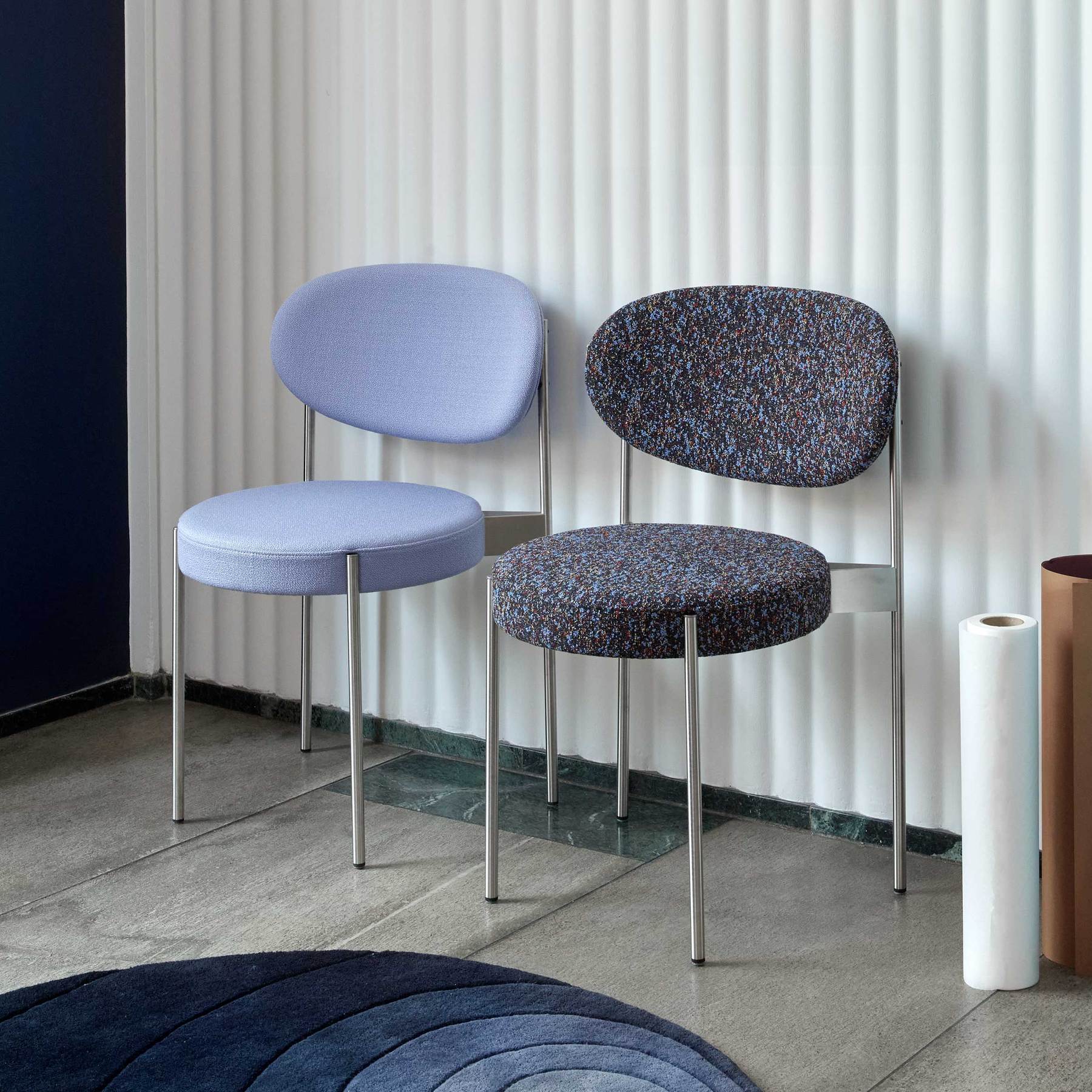 Verner Panton designed the Series 430 Chair as a study in simplicity, while providing the same comfort as an armchair. He did so by applying traditional webbing to the fully upholstered seat to adjust for body weight and create a wide nestling backrest and place it on a slender elegant frame that mounts on the outside of the seat and back.