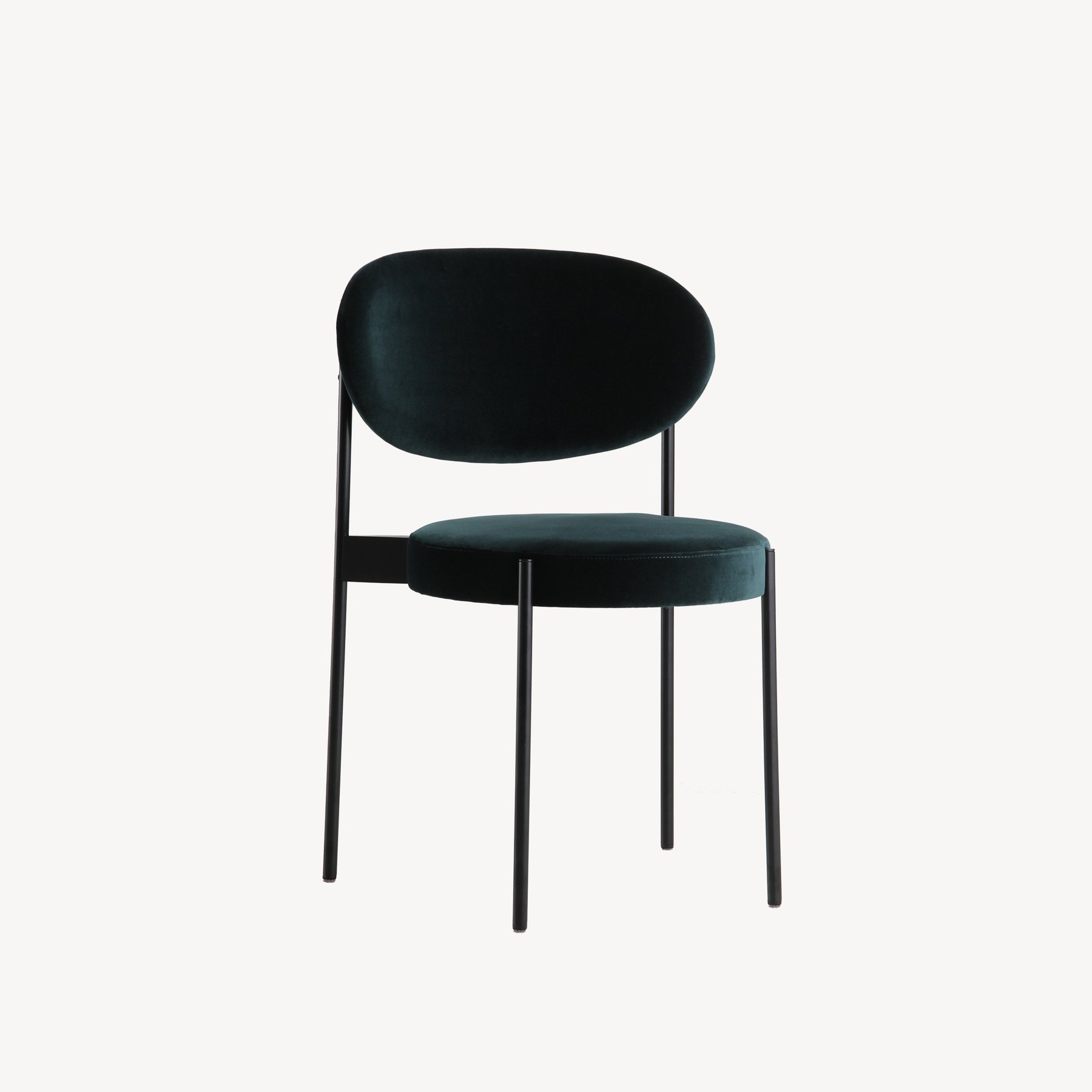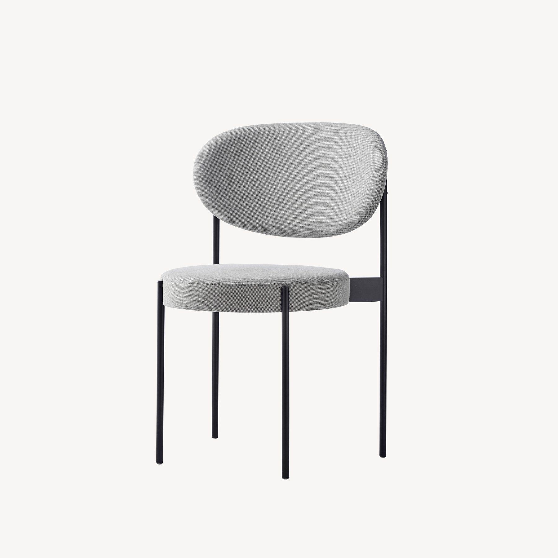 Verner Panton designed the Series 430 Chair as a study in simplicity, while providing the same comfort as an armchair. He did so by applying traditional webbing to the fully upholstered seat to adjust for body weight and create a wide nestling backrest and place it on a slender elegant frame that mounts on the outside of the seat and back.