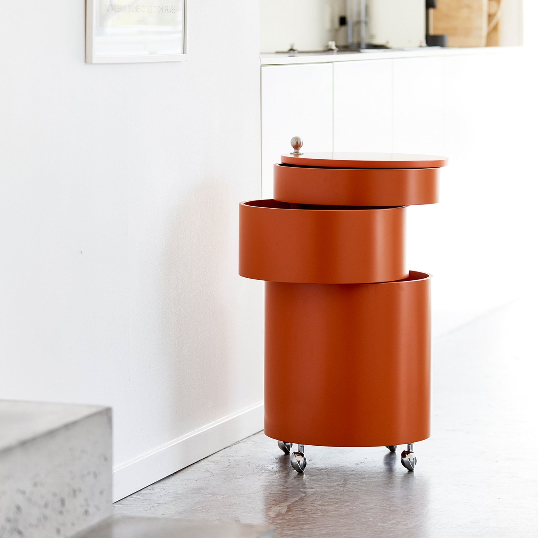 Adaptable side table and mobile storage unit in one. Barboy consists of three oval-shaped drawers, which can be pulled out fully so the whole surface can be used. Barboy is a typical example of Panton’s furniture, in which he combines a matt surface with a shiny chrome handle and wheels, investing the piece with an elegant contrast.