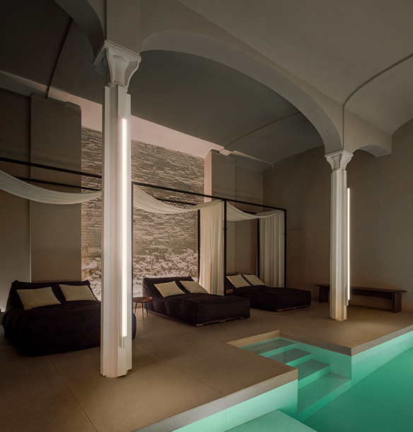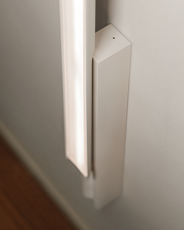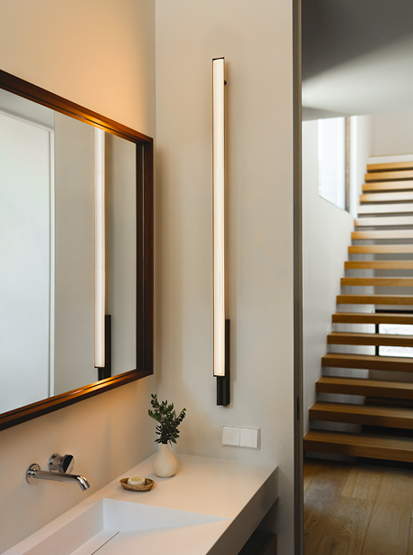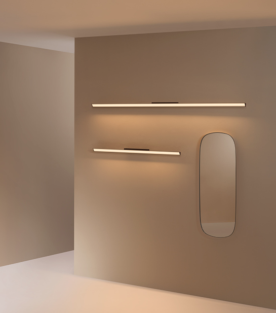 Minimalist and refined in form, the Spa wall lamp is an adaptable system of linear LEDs that allows for limitless compositional freedom to create a broad range of atmospheres, from intimate corners for personal wellbeing to functional spaces designed for general wellness. Particularly apt as a vanity light, the Spa wall lamp is positioned at an angle to send diffuse, ambiance light in the desired direction.