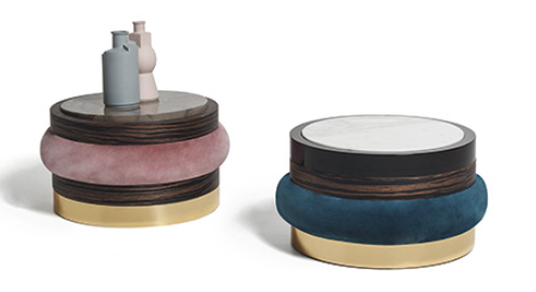 Materials and shapes can be combined giving birth to unique elements. Its structure is made of overlapping rings available in different materials: fabric, lacquered wood, ebony or Canaletto walnut wood, polished brass.