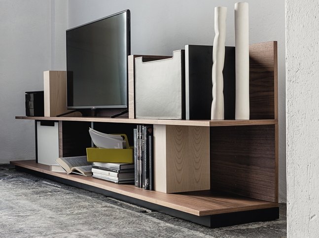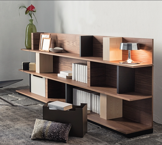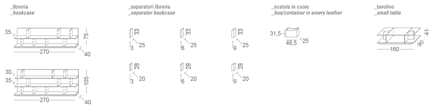 Vibieffe 9800 Ala is a coffee table and a wall bookshelf available in different heights, with shelf dividers and leather boxes.