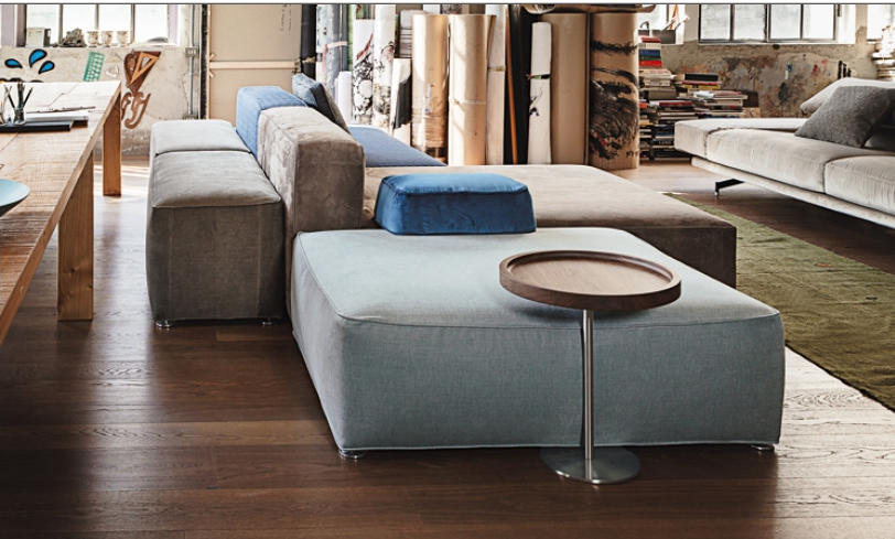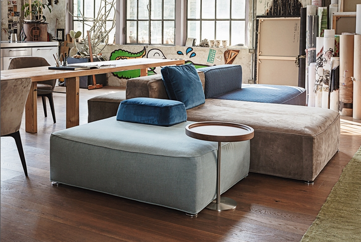 275 Glam is an extremely customizable sofa and can be combined in endless variants by choosing single elements with different sizes along with corner and end elements, which can also be without backrest and cushion. Also, armrest and backrest for the ottoman have been designed to be freely and easily moveable cushions characterized by a base that ensures stability. The ottomans' large sizes allow them to be used as stand-alone elements or as chaise-longues. Other ottomans with different sizes and heights are suitable to be used as comfortable seats.