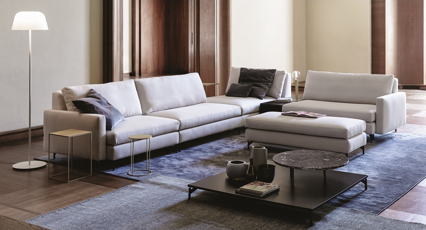 Vibieffe 525 Nordic is a custom modular sofa equipped with headrest, ottoman, chaise longue and a built-in storage box. It is available with completely removable cotton, linen, leather or custom covers. The 525 Nordic sofa can be complemented by matching armchair and coffee table.