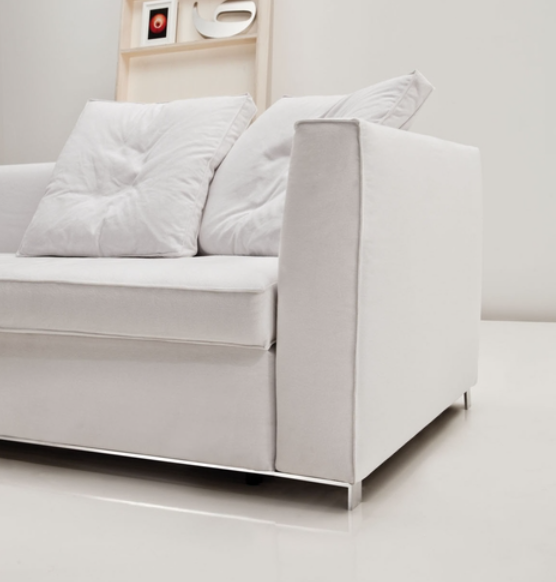 Vibieffe 2800 Bel Air is a modular two-seat sofa bed with chaise-longue and storage space, available with completely removable covers in cotton, linen, leather or with custom covers.