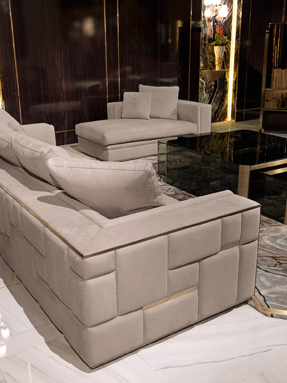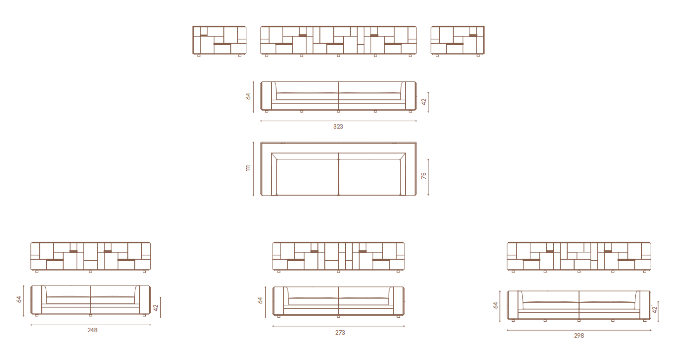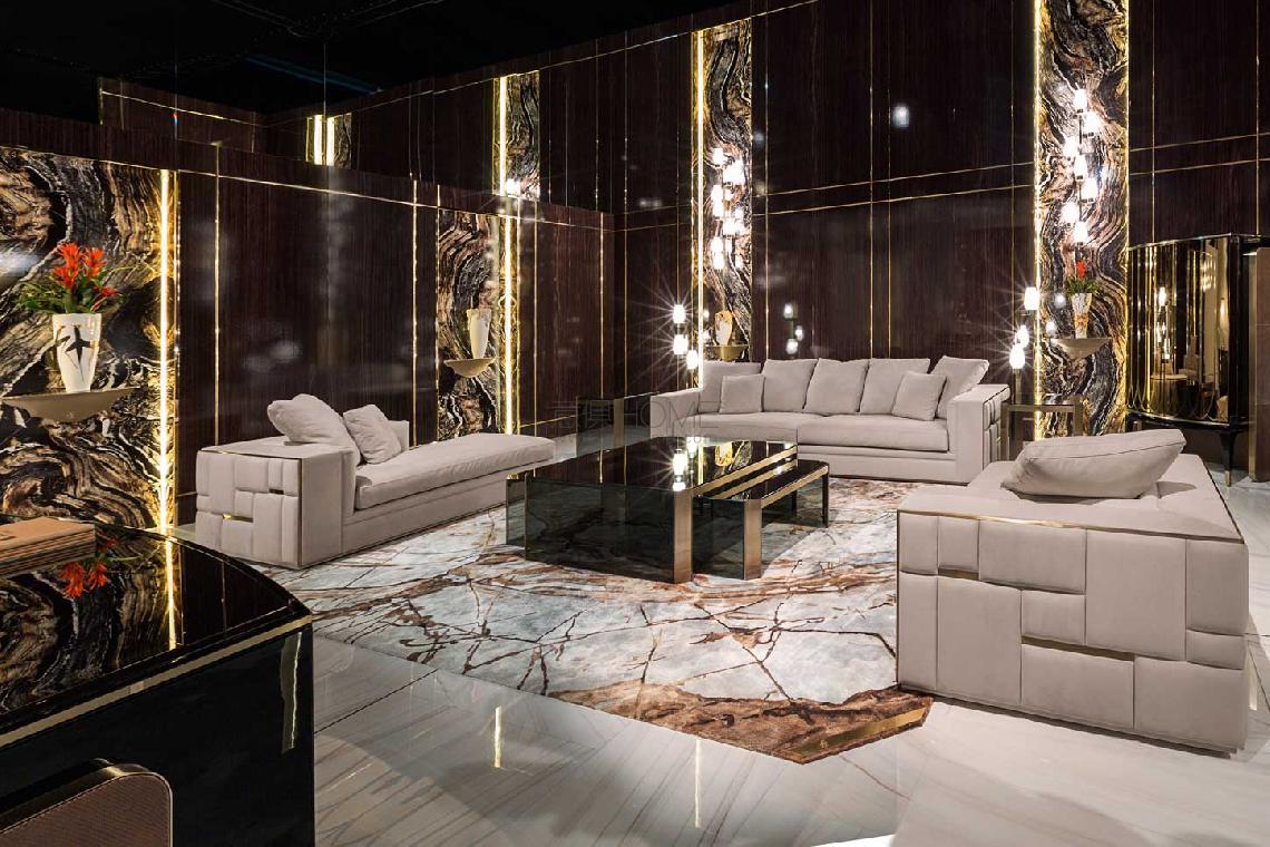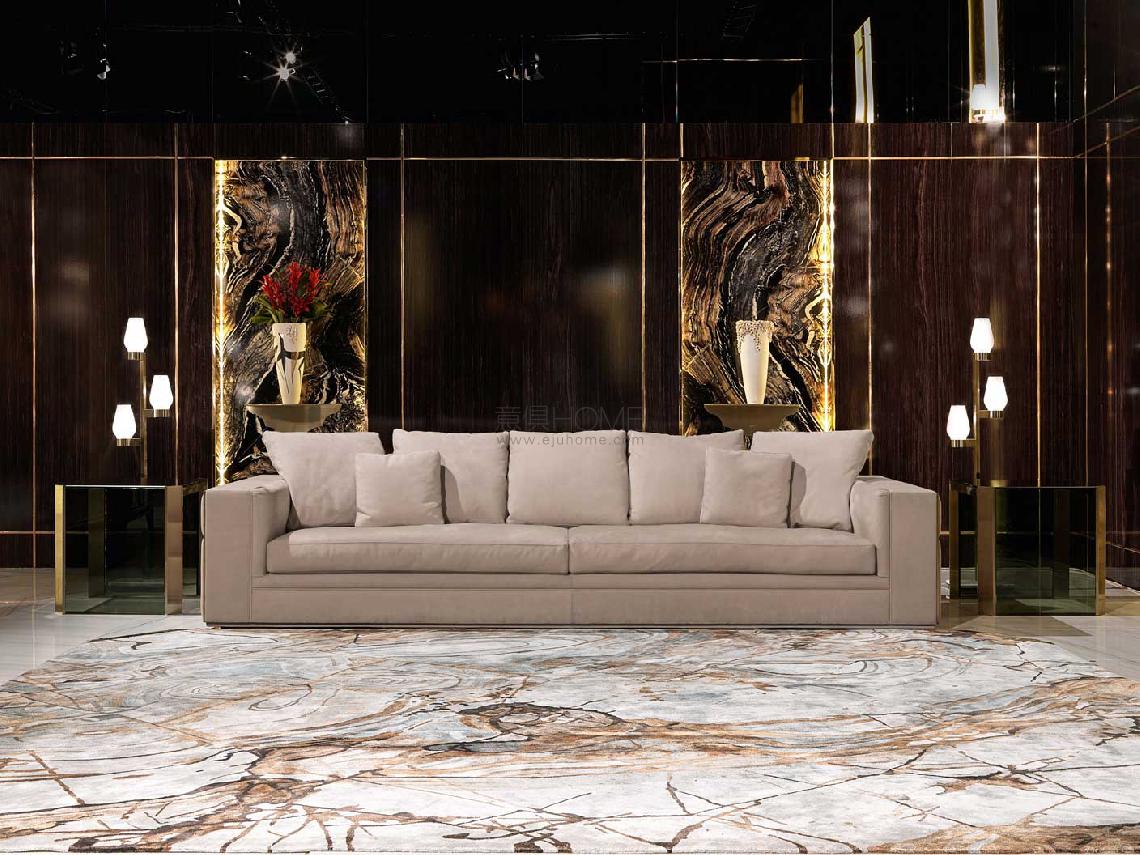 Internal structure in solid wood and plywood with elastic strap springing system; padding in polyurethane foam. Backrest and armrests externally upholstered with slightly padded tiles, creating an abstract geometrical motive and inserts in satinized steel with logo; smooth upper surface of the armrests; perimetral profifile in satinized stainless steel with clips with engraved Visionnaire logo. Upholstery in leather or fabric. Seat cushions in polyurethane, upper layer in Memory Foam? and goose feathers. Loose cushions in goose feathers. Optional element available: low table with upholstered magazine-holder shelf and top in marble. Metal parts available in the satinized metal fifinishing selection.