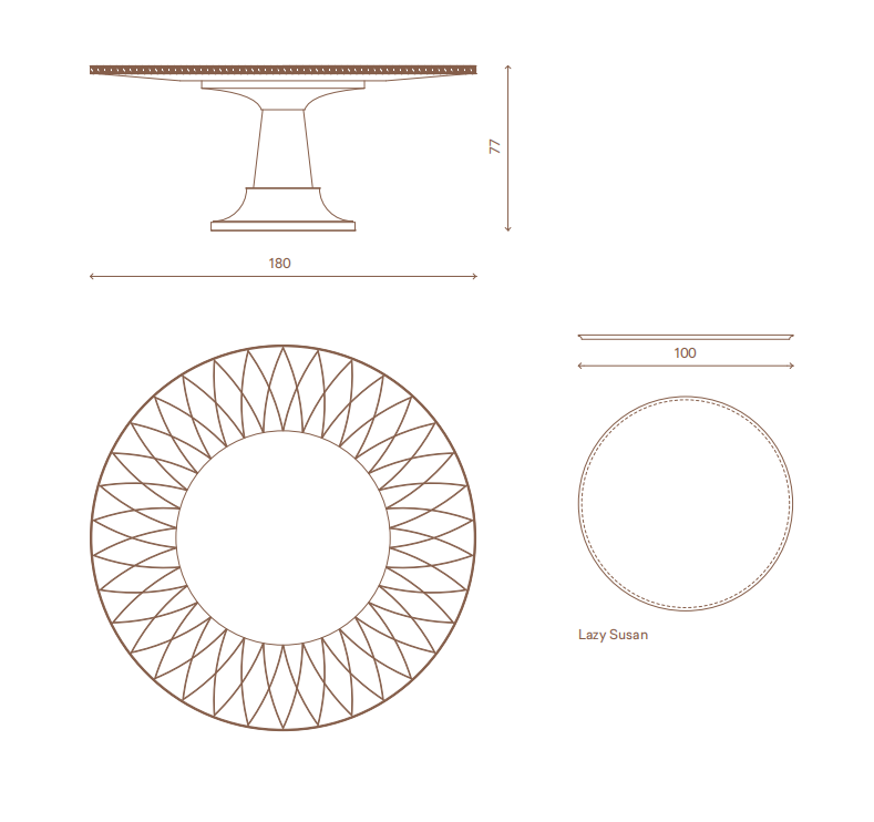 Marble and amethyst inlaid top with design in Mistery White, Nero Marquina, Purple Amethyst and 3mm stainless steel profifile chrome fifinishing. Top frame in stainless steel with geometric decoration obtained through different handmade procedures of polishing and brushing. Under top of turned lacquered polished 100 gloss wood (RAL colours). Base composed by a conical column on a shaped chromed metal base. Central support and ballast under base in painted iron. Several combinations are possible. Top profifile in chromed fifinishing. Base metal parts are available in golden, bronze and black nickel fifinishing. Lazy Susan in marble with safety edge and rotating weight holder system.