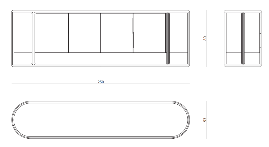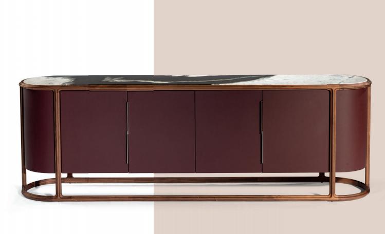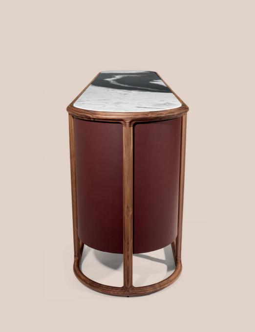 Low unit with curved lateral sides, external structure in carved Canaletto walnut solid wood, internal structure in wood with doors and sides finished with lacquering or leather or fabric upholstery. Handles in metal. Internally lacquered in matt RAL colours. Built-in top in marble. Available with internal LED light.