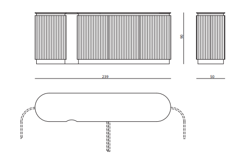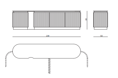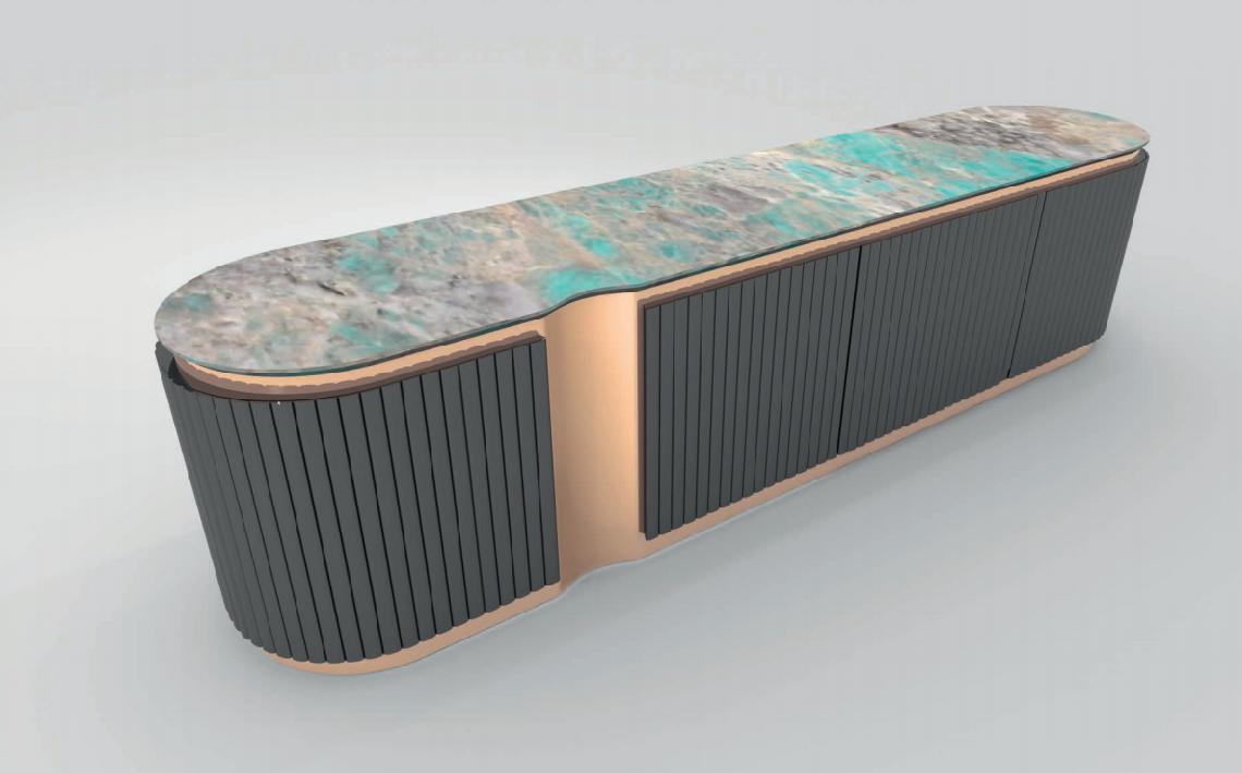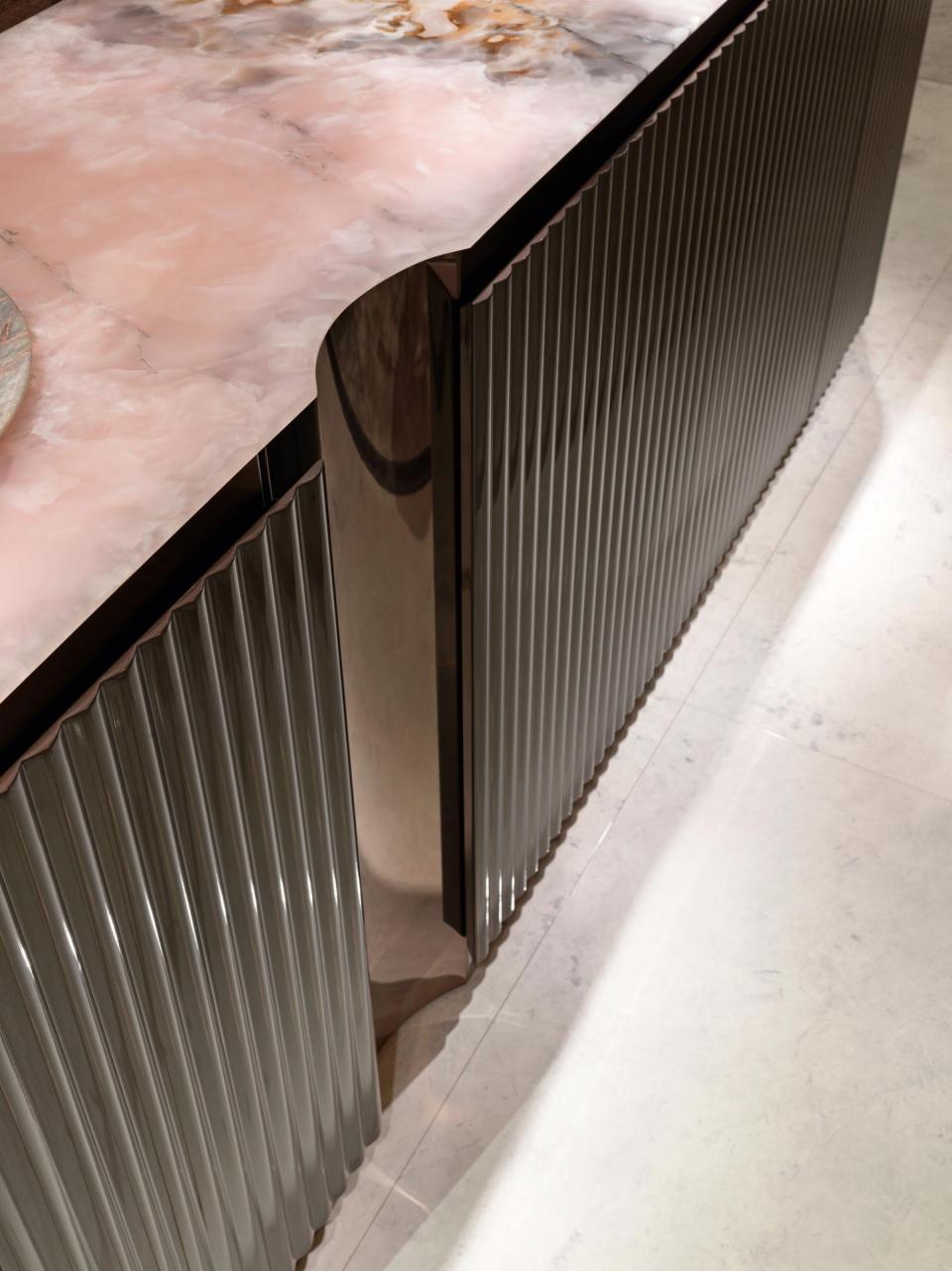 High unit with curved lateral sides; structure in wood with ribbed doors and sides, available either lacquered or upholstered in leather or fabric. Internal structure equipped with drawers lacquered in matt RAL colours. Base and decorative profiles in curved stainless steel. Marble top with bevelled profile.