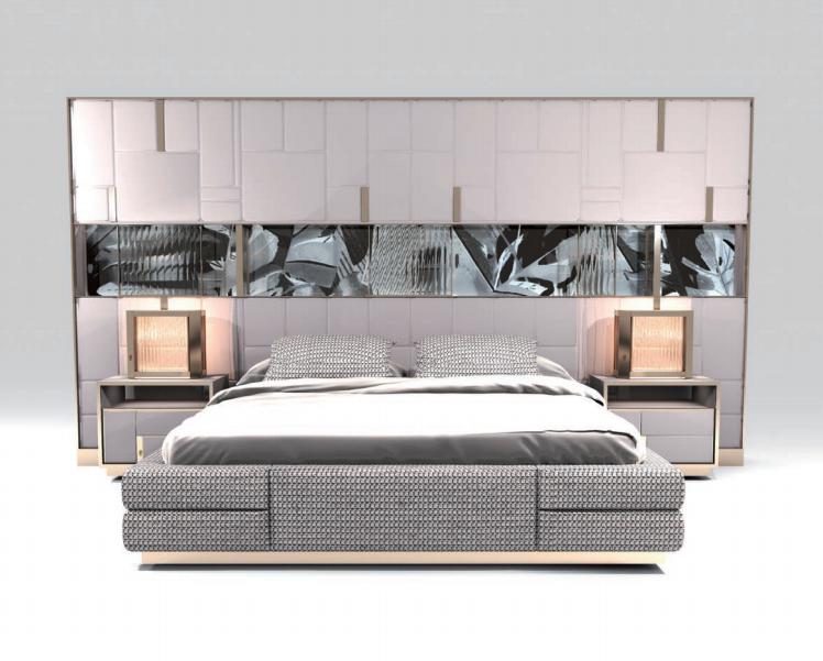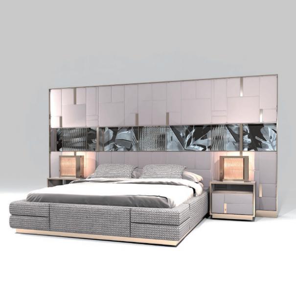 Bed upholstered in leather or fabric. Headboard upholstery decorated with geometric pattern, structure in plywood with upholstered panels, slightly padded one by one. Plinth and inserts in satinized stainless steel with engraved logo, storage niche with back covered with an artistic panel by Michele Astolfi, made in printed polycarbonate and decorated with glass inserts and Swarovski crystals. Courtesy LED lights. Bedframe in plywood consisting of several elements padded one by one with polyurethane foam and decorated with four inserts, bed base in satinized stainless steel.