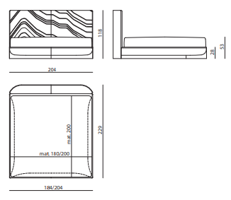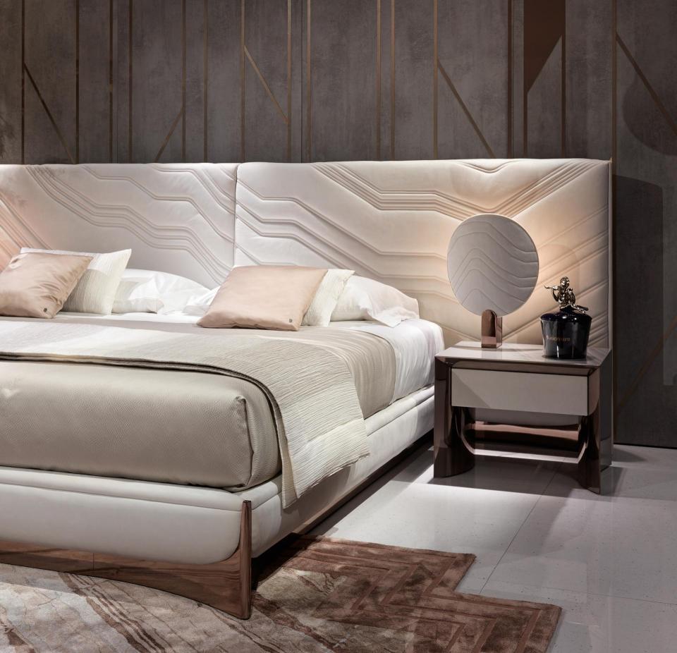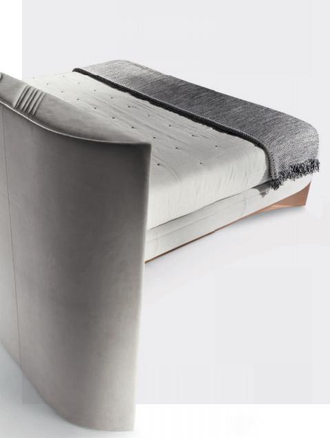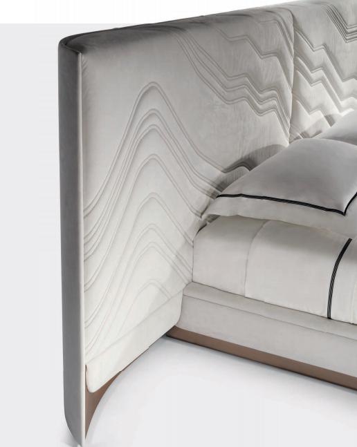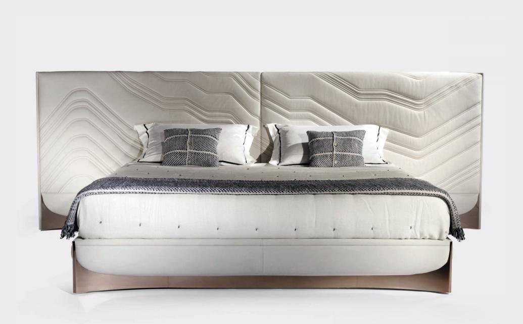 Bed with non-removable upholstery in leather or fabric with embroidered headboard decorated with quilted motif, shaped bed frame, structure in plywood and solid wood with integrated wooden slats; padding in multidensity polyurethane foam. Shaped base in wood coated in curved stainless steel with concave profile.