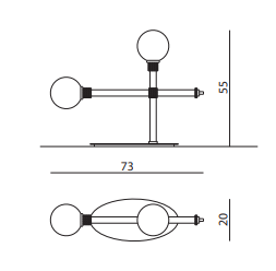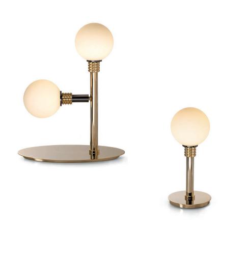 Table lamp in brass and blown glass. Tubular structure in brass with bicolour finish and rings in carved solid brass. Spherical light diffuser in blown glass with satin opaline finish. Available in small, medium and big version.