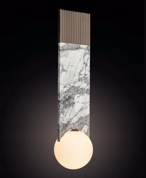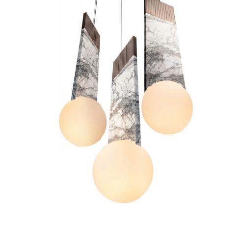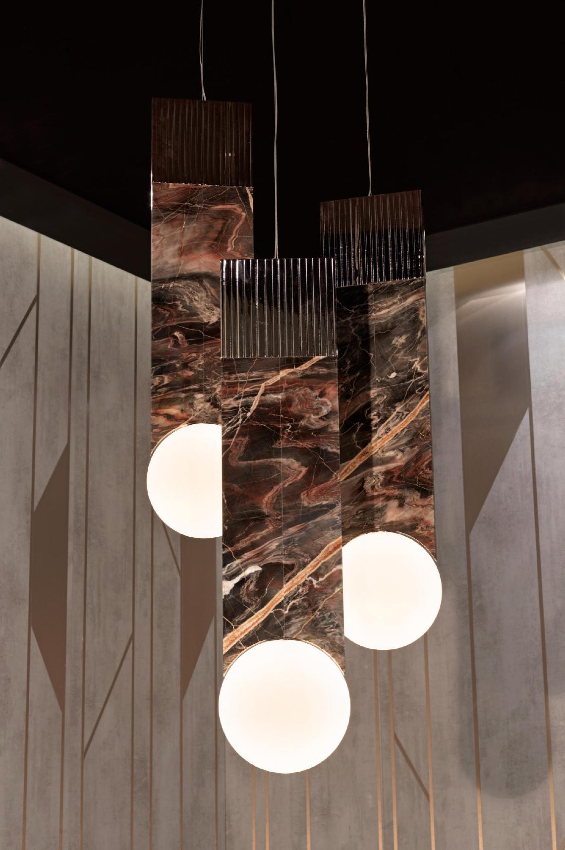 Pendant lamp in marble and steel. Structure in metal with lowrelief stripes decoration and central part coated in marble. Round light diffuser in blown glass with satin opaline finish.