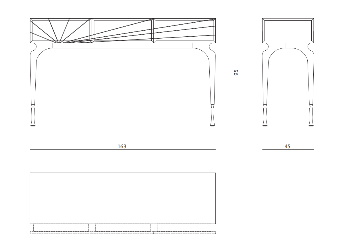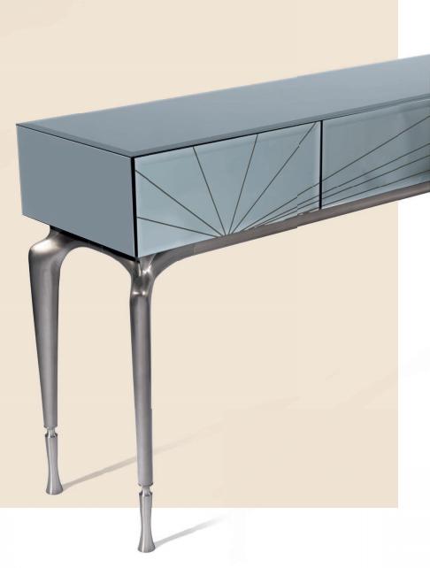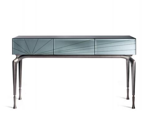 Wooden console with 3 drawers covered with mirror glass with  bevelled edges; wooden structure internally matt lacquered  (in RAL colours). Drawers covered with glass with bevelled  edges and rear-sanded decoration. Legs in aluminium cast  with mirror polished finishing and tips in satin aluminium.