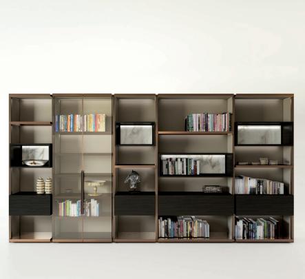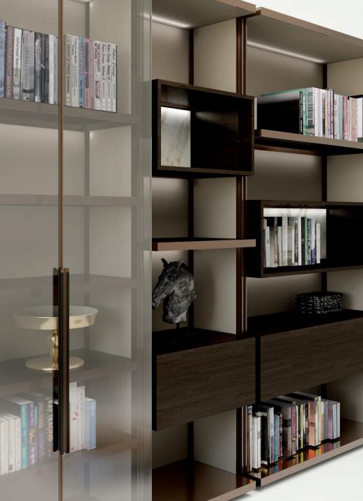 Modular library composition in aluminium and glass. Supporting lateral sides consisting of a double pillar made in powder-coated aluminium with a shiny decorative profile, and lateral panels upholstered in leather or fabric, or coated in veneered wood, marble or decorative laminate. Pillars supplied with electrified track for LED light and hidden predrilled holes to adjust the height of the shelves. Shelves in aluminium with crystal glass surface and profile with LED light, and equipped with plug & play technology to move shelves without using tools. Open shelves in wood (lacquered or veneered) with back in marble and perimetral light. Chests of drawers (lacquered or veneered) can be customised internally, adding a cutlery or bottle drawer. The composition consists of open units with or without back (available either upholstered in leather or fabric, or coated with decorative laminate). Modular units can be configured with doors in boxed tempered crystal glass (width 8 mm) with handles in aluminium with polished finish or leather upholstery