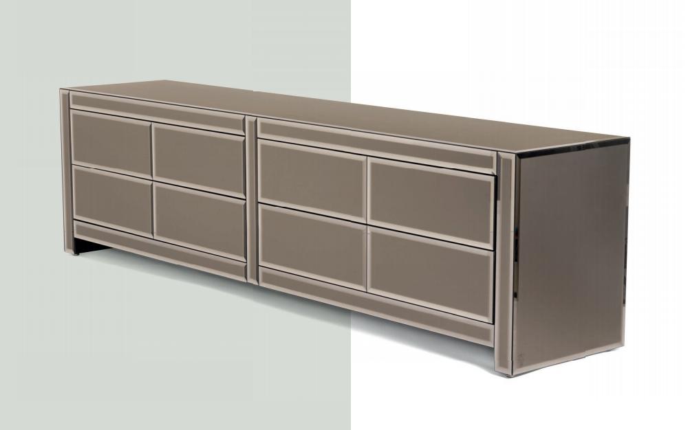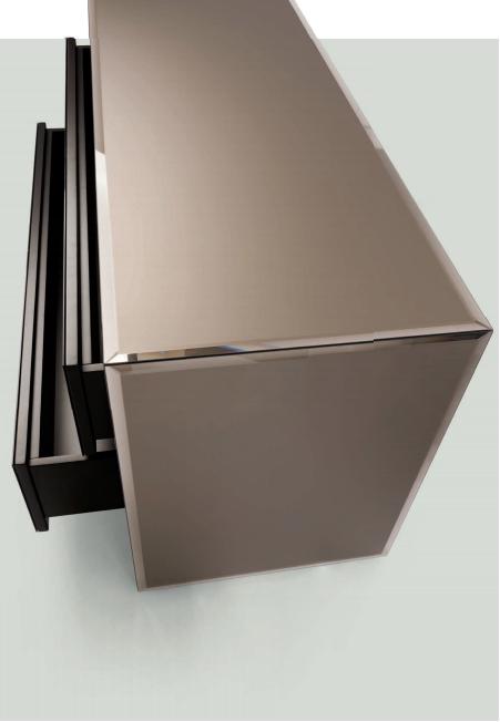 Chest of four drawers in wood coated in satinized mirror with shiny bevelled edges; internally lacquered in matt RAL colours.