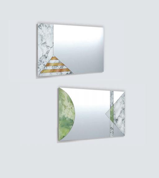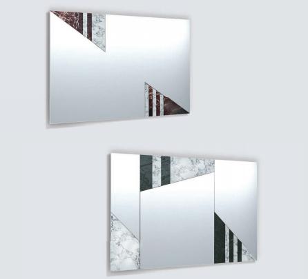 Mirror in marble and glass, frame in satinized stainless steel.  Combination of marbles in different shapes and colours.