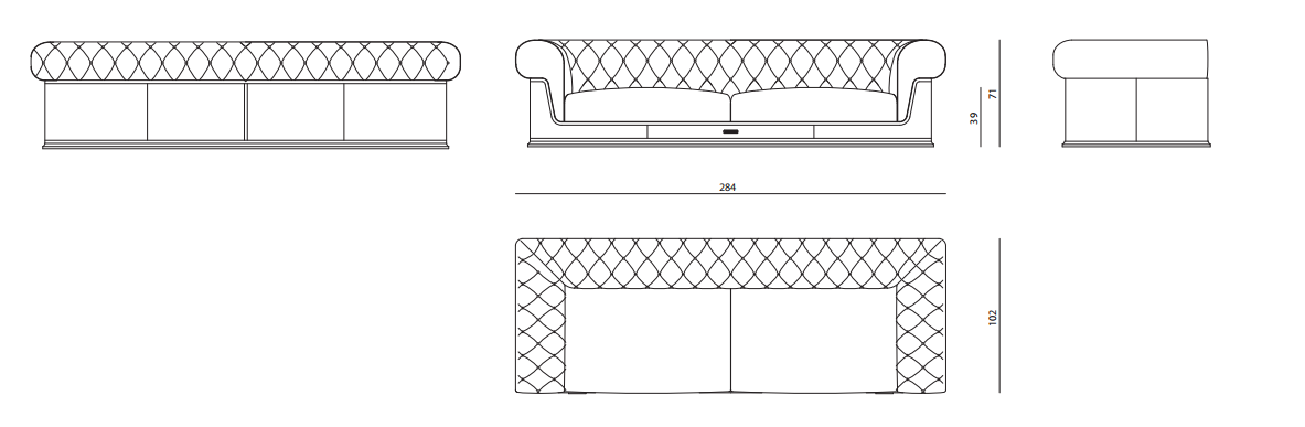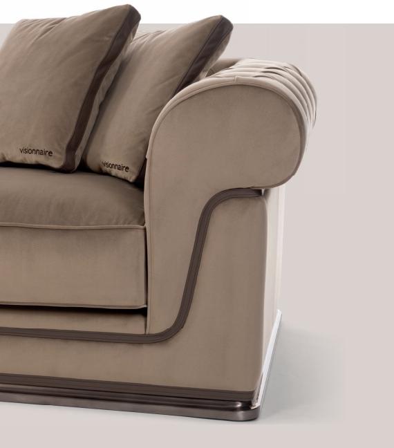Sofa with non-removable upholstery in leather and fabric. Structure in plywood and solid wood, seat structure with elastic webbing stretch bands. Seat padding in multi-density polyurethane, Memory Foam? and feather, capitonné backrest. Finishing bands in leather and brass logo. Shaped plinth in satinized aluminium.