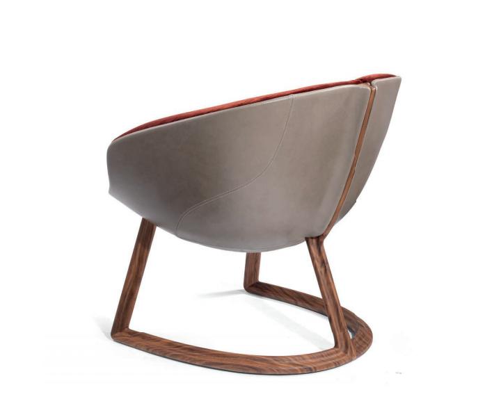 Small armchair with main structure in printed resin and padding in multi-density polyurethane foam, upholstered in leather or fabric. External structure upholstered in leather or lacquered. Curved base carved from Canaletto walnut solid wood, partly embedded the rear backrest.