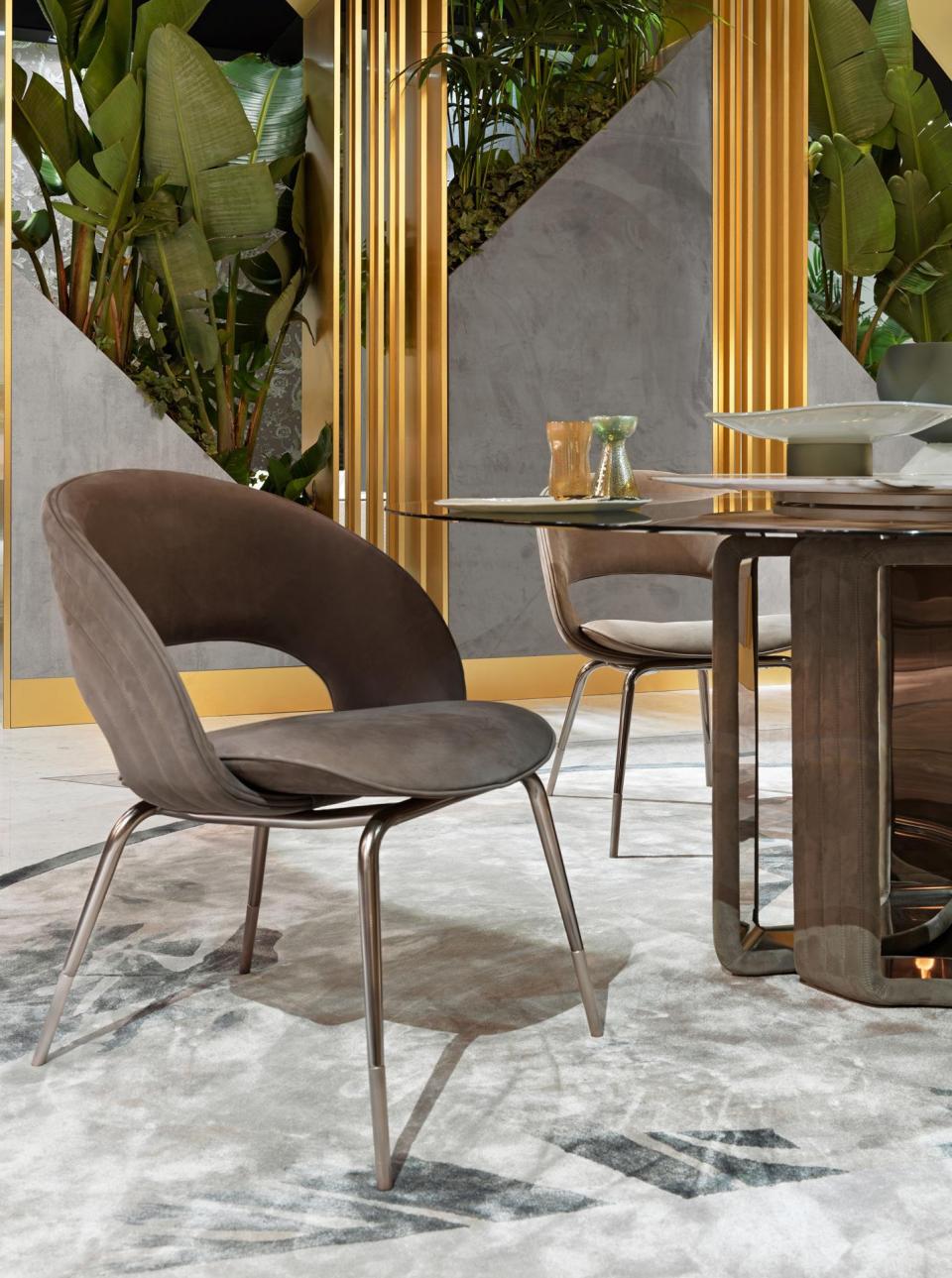 Chair in curved wood with tubular conic legs and turned feet. Quilted upholstery in leather or fabric, and metal inserts running along the backrest edge.