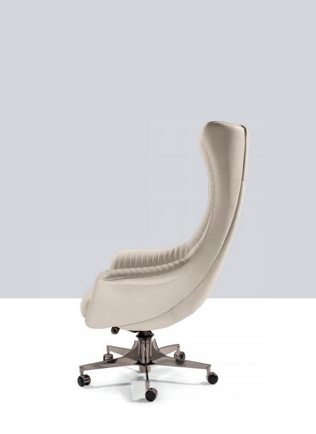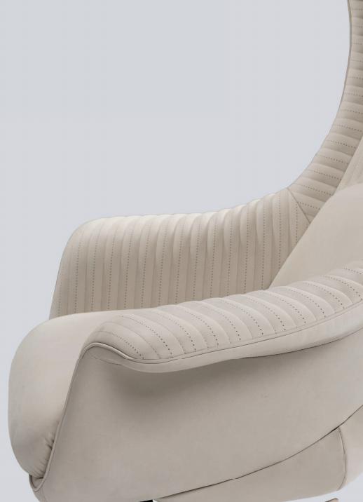 Main structure in plywood and solid wood, with elastic stretch bands on the seat. Seat and armrests padding in multi-density polyurethane foam. Upholstery in leather, armrests and backrest decorated with embroidered and perforated quilting. Curved external structure upholstered in leather. 5-wheels base in stainless steel with aluminium turnings. Rotating piston, adjustable in height, with damping and tilt lock mechanisms.