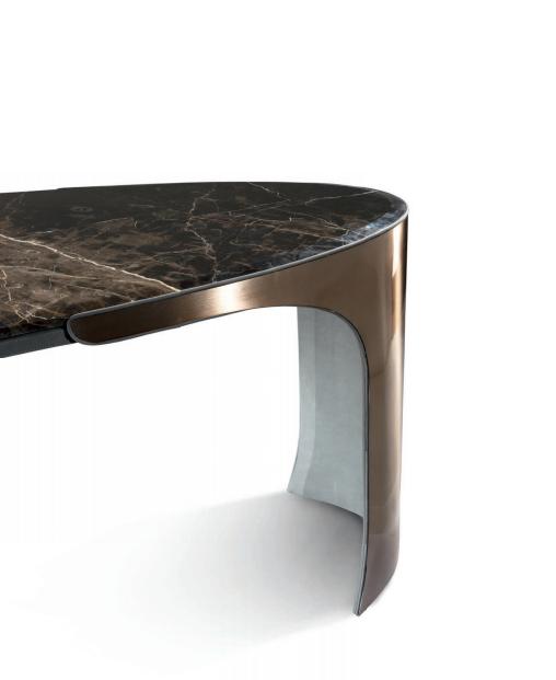 Desk with leather upholstery and marble top. Main structure in shaped wood, internally upholstered in leather, alternating plain and lozenge-quilted upholstery; equipped with two drawers with handles in leather and brass, and cable guide. Leg in curved wood, internally upholstered in leather and externally coated in curved satinized stainless steel. Oval top in bevelled and polished marble, with cable guide.