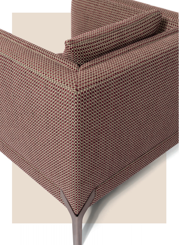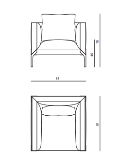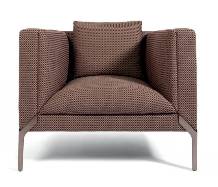 Small armchair with non-removable upholstery in leather or fabric, structure in plywood and solid wood with elastic webbing stretch bands, padding in multi-density polyurethane foam, Memory Foam? and feather. Loose cushions in feather. Dove-tail feet in stainless steel.