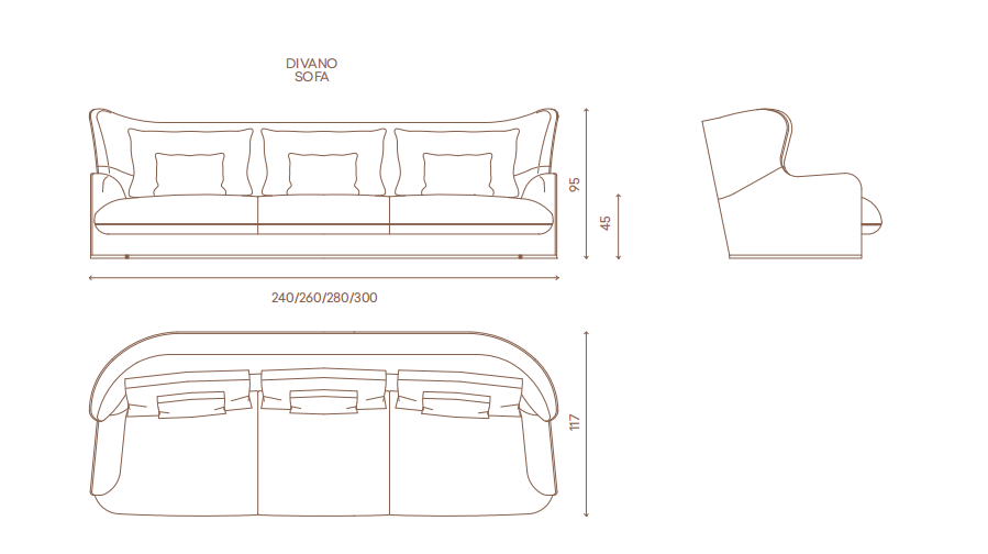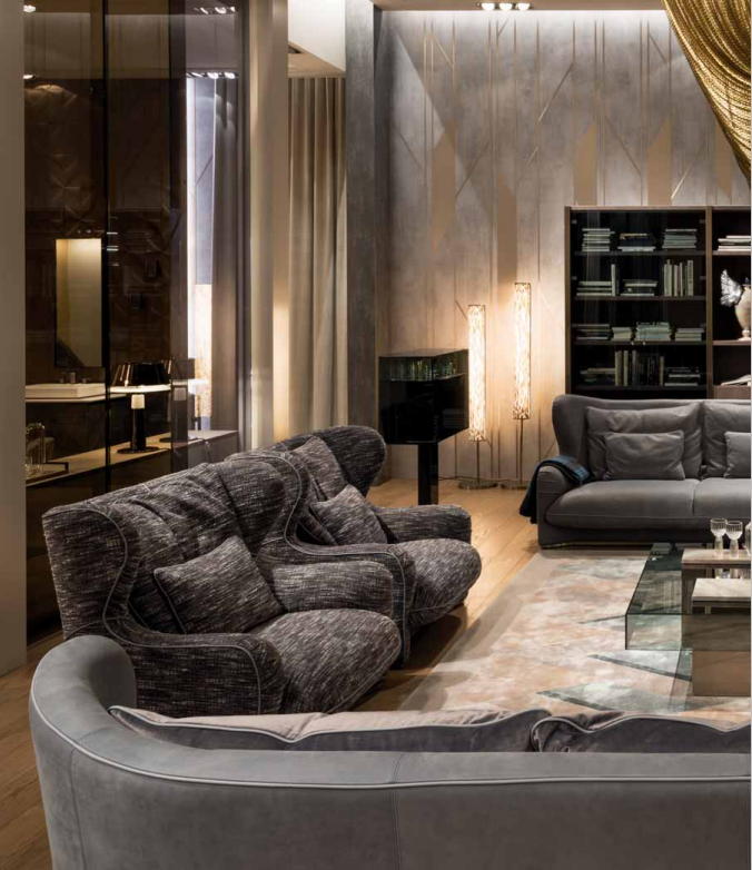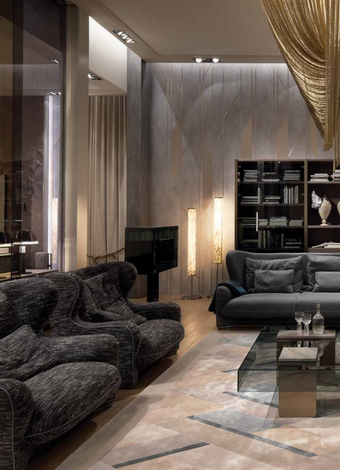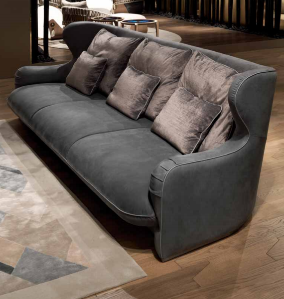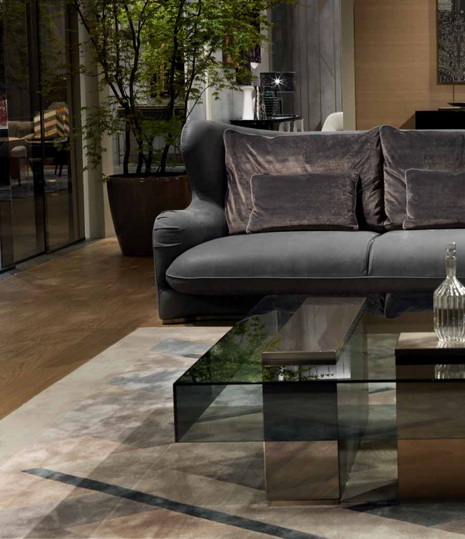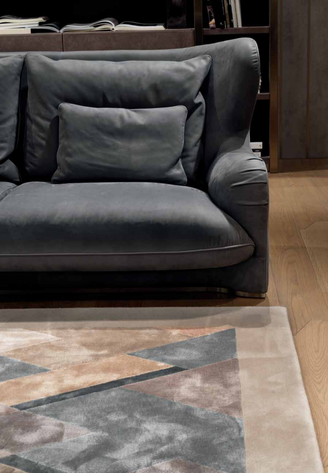 Internal structure in solid wood and plywood with elastic suspension. Suspended shell and upholstered seat cushions with fifixed cover, upholster in leather or fabric. High back and bergère sides. Padding in different density polyurethane, memory foam? and feather. Back cushions and down cushions in feather. Base covered in satin stainless steel. Also available pouffe with internal structure in solid wood and plywood, padded in polyurethane with different densities. Upholstery in leather or fabric. Metal parts available in the satinized metal fifinishing selection.