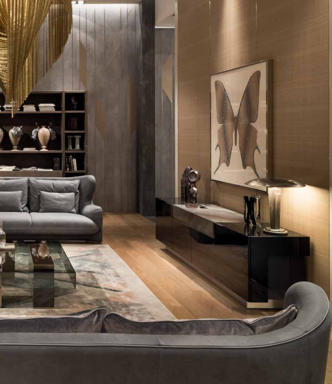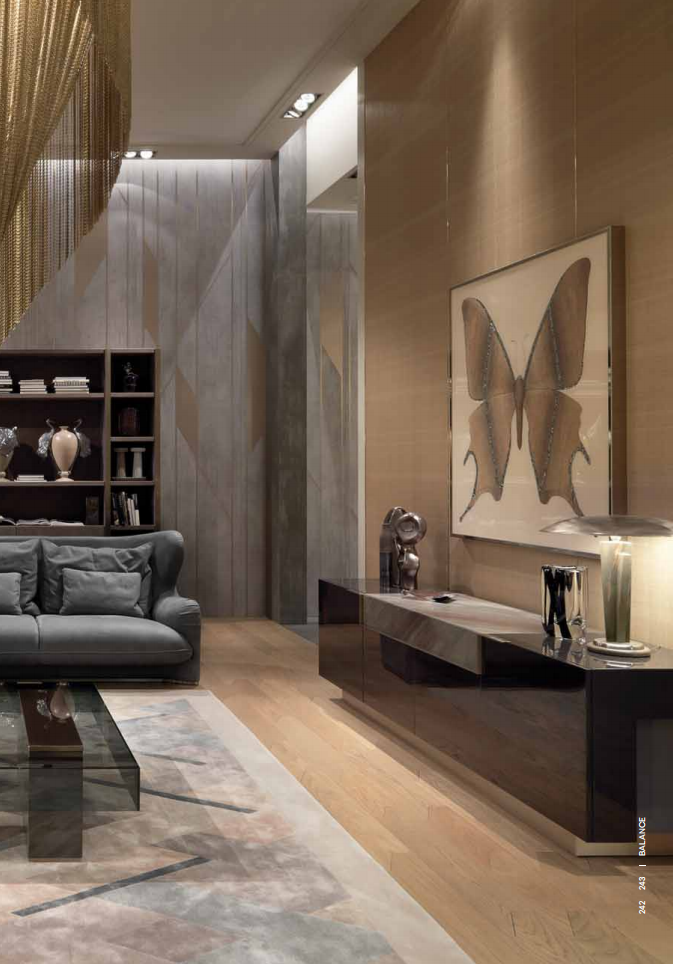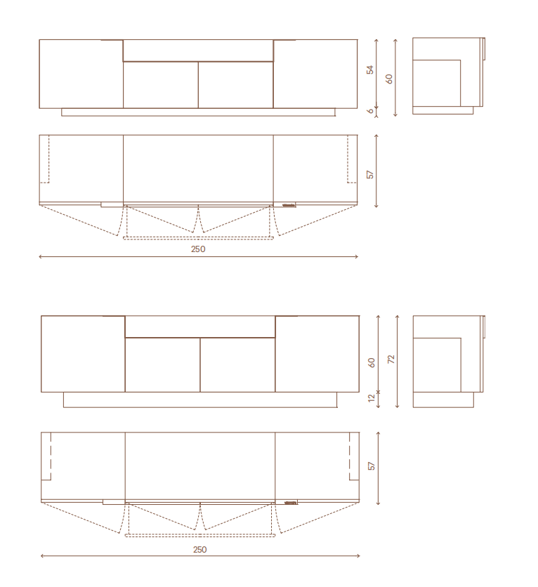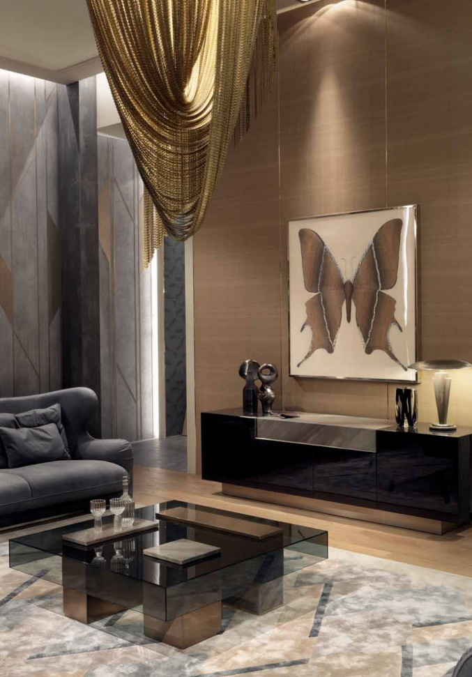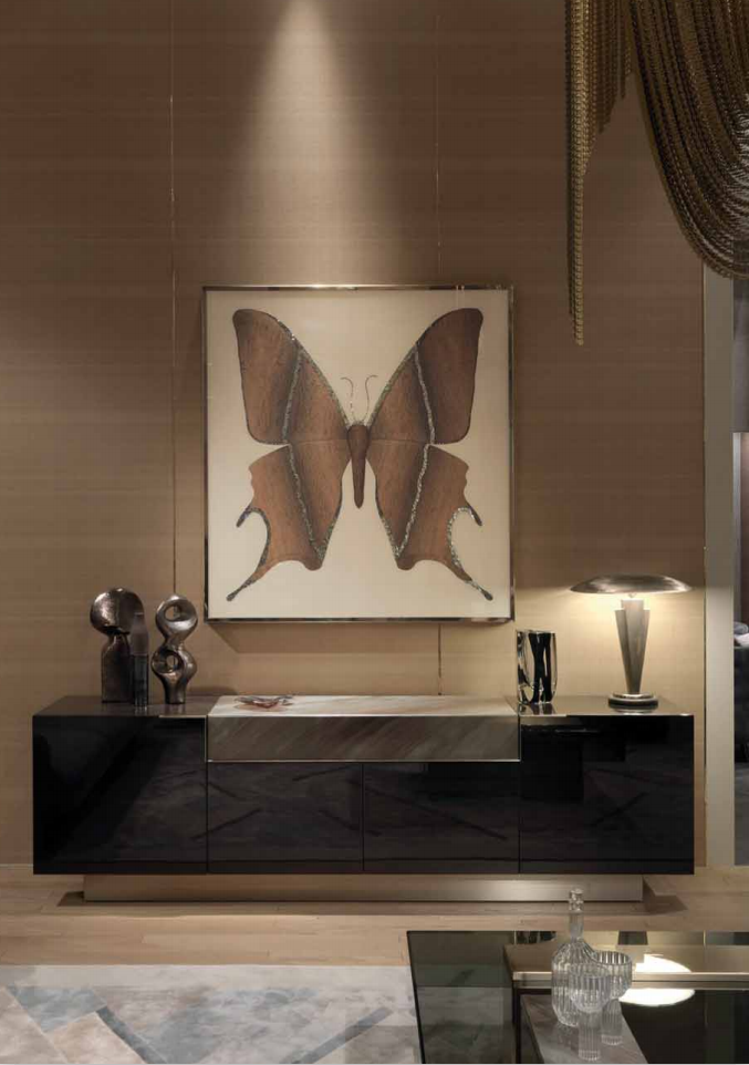 Low cabinet in veneered wood with shaped sides and marble top. Four doors in wood and a drawer with marble front with edges coupled to 45°, handles in satin fifinish 100 gloss lacquered wood interior and extra-clear glass shelves th.8 mm. Drawer internally lined in microfifibre. Base in satined stainless steel. Wooden parts available in the veneer fifinishings selection, metal parts available in the metal fifinishing selection.